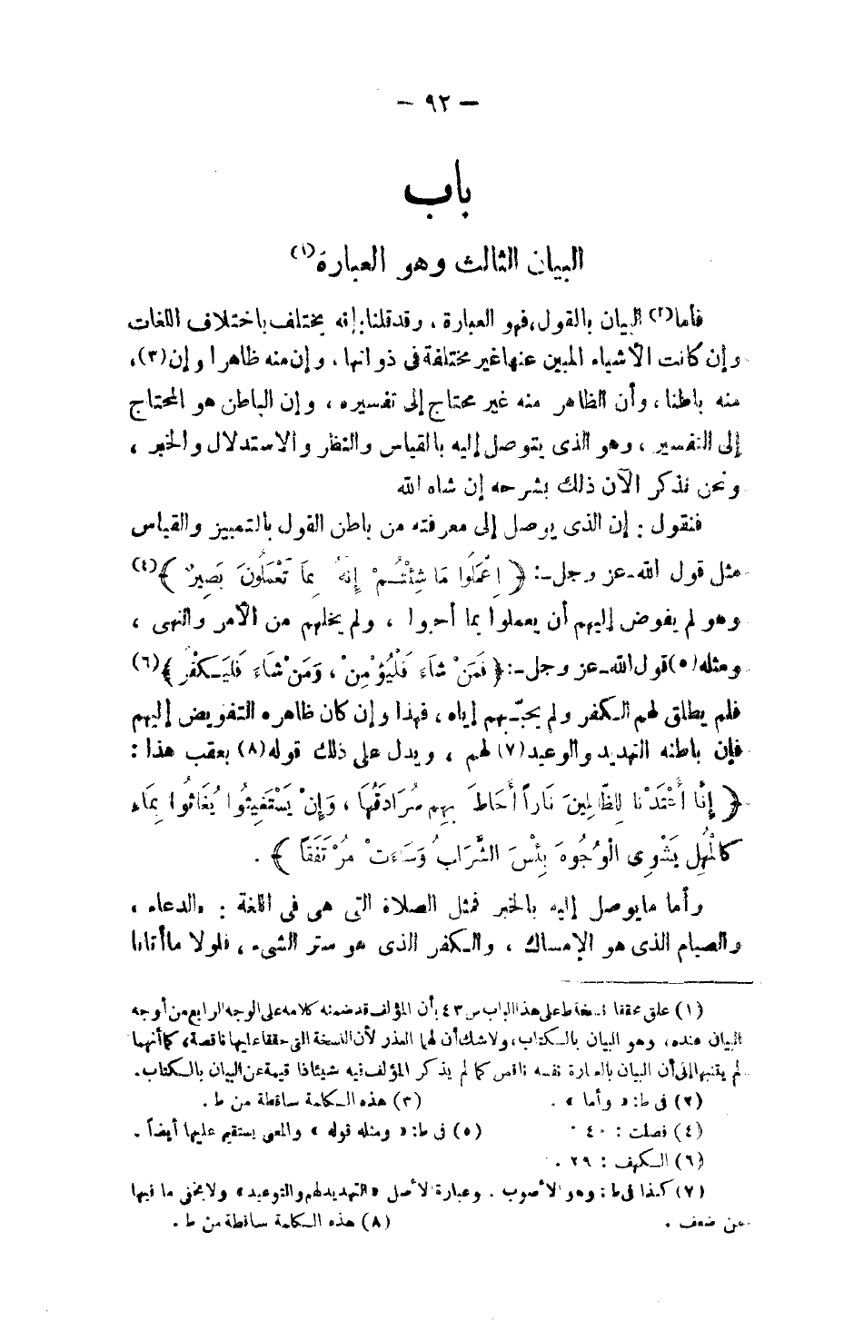 فأما البيان بالقول، فهو العبارة، وقد قلنا: إنه يختلف باختلاف اللغات وإن كانت الأشياء المبين عنها غير مختلفة في ذواتها، وإن منه ظاهراً وإن، منه باطناً، وأن الظاهر منه غير محتاج إلى تفسيره، وإن الباطن هو المحتاج إلى التفسير، وهو الذي يتوصل إليه بالقياس والنظر والاستدلال والخبر، ونحن نذكر الآن ذلك بشرحه إن شاء الله.