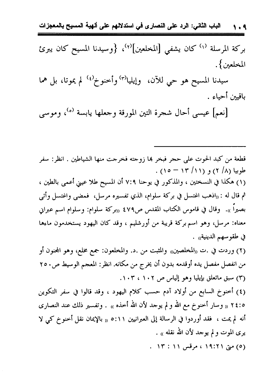 1 هكذا في النسختين، والمذكور في يوحنا 7:9 أن المسيح طلا عيني أعمى بالطين، ثم قال له: ((اذهب اغتسل في بركة سلوام، الذي تفسيره مرسل، فمضى واغتسل وأتى بصيراً)) .وقال في قاموس الكتاب المقدس ص479 ((بركة سلوام: وسلوام اسم عبراني معناه: مرسل، وهو اسم بركة قريبة من أورشليم، وقد كان اليهود يستخدمون ماءها في طقوسهم الدينية)) .
