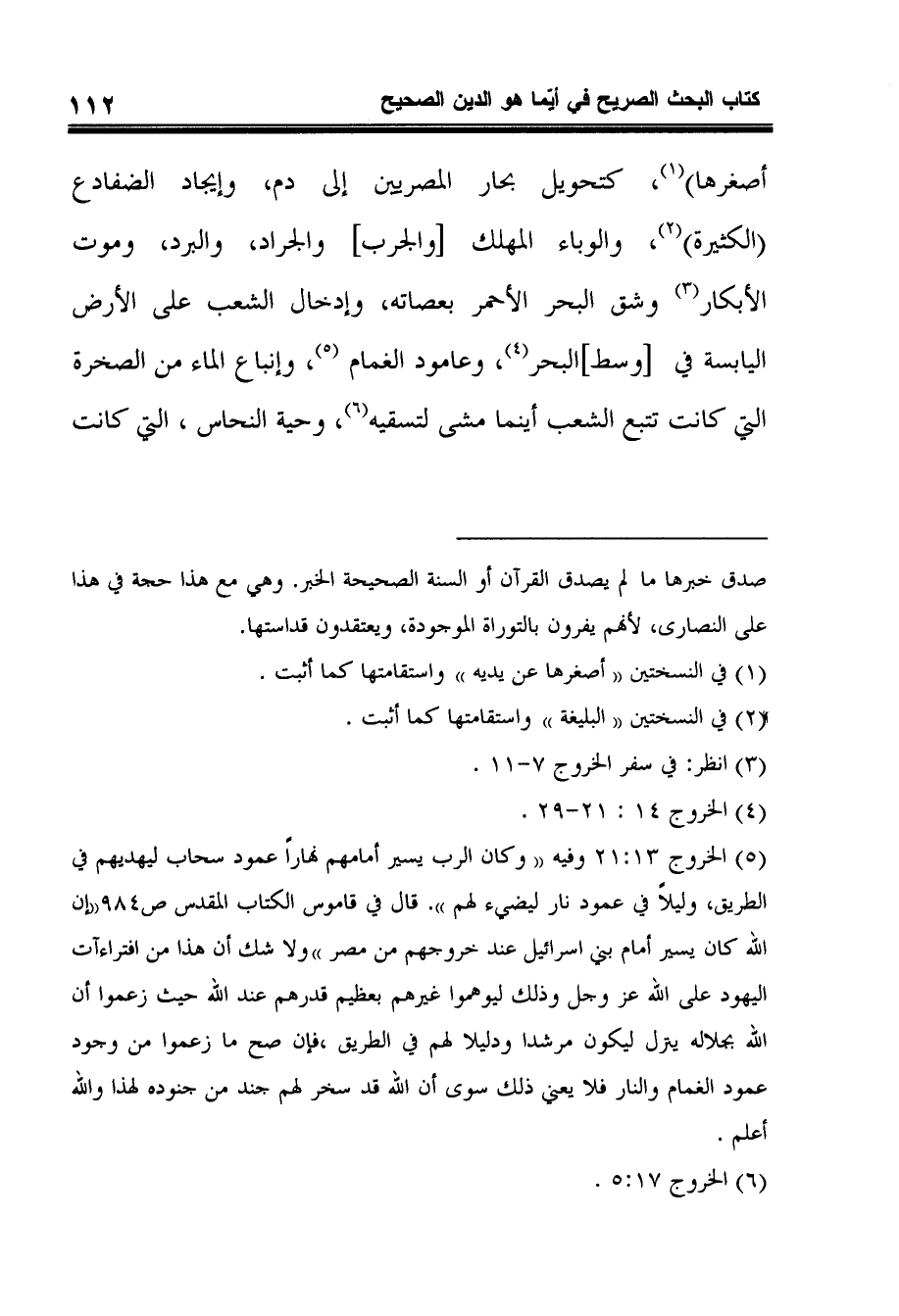 5 الخروج 21:13 وفيه ((وكان الرب يسير أمامهم نهاراً عمود سحاب ليهديهم في الطريق، وليلاً في عمود نار ليضيء لهم)) . قال في قاموس الكتاب المقدس ص984 ((إن الله كان يسير أمام بني اسرائيل عند خروجهم من مصر)) ولا شك أن هذا من افتراءآت اليهود على الله عز وجل وذلك ليوهموا غيرهم بعظيم قدرهم عند الله حيث زعموا أن الله بجلاله ينزل ليكون مرشدا ودليلا لهم في الطريق، فإن صح ما زعموا من وجود عمود الغمام والنار فلا يعني ذلك سوى أن الله قد سخر لهم جند من جنوده لهذا والله أعلم.