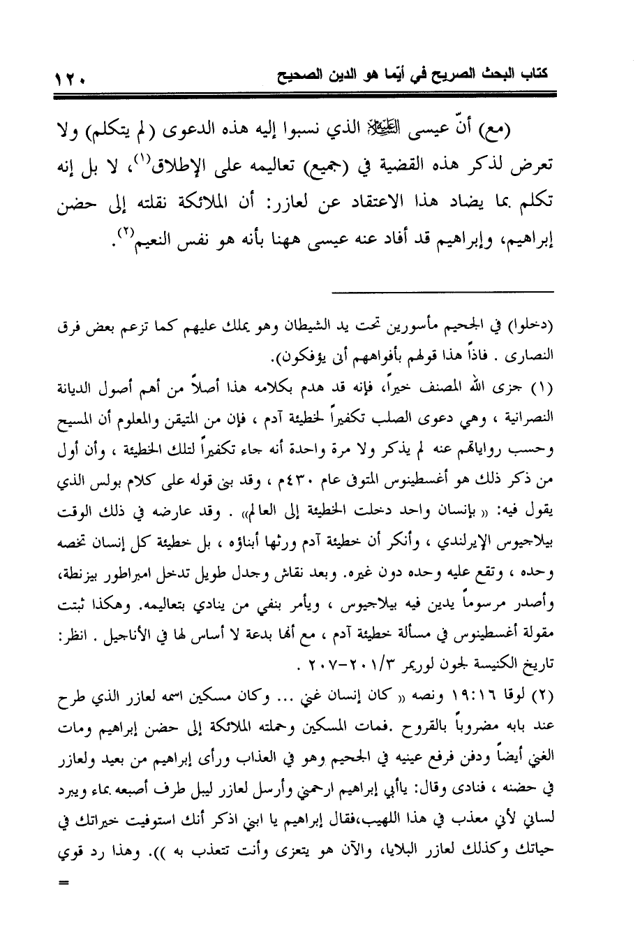 مع أنّ عيسى عليه السلام الذي نسبوا إليه هذه الدعوى لم يتكلم ولا تعرض لذكر هذه القضية في جميع تعاليمه على الإطلاق1، لا بل إنه تكلم بما يضاد هذا الاعتقاد عن لعازر: أن الملائكة نقلته إلى حضن إبراهيم، وإبراهيم قد أفاد عنه عيسى ههنا بأنه هو نفس النعيم2.