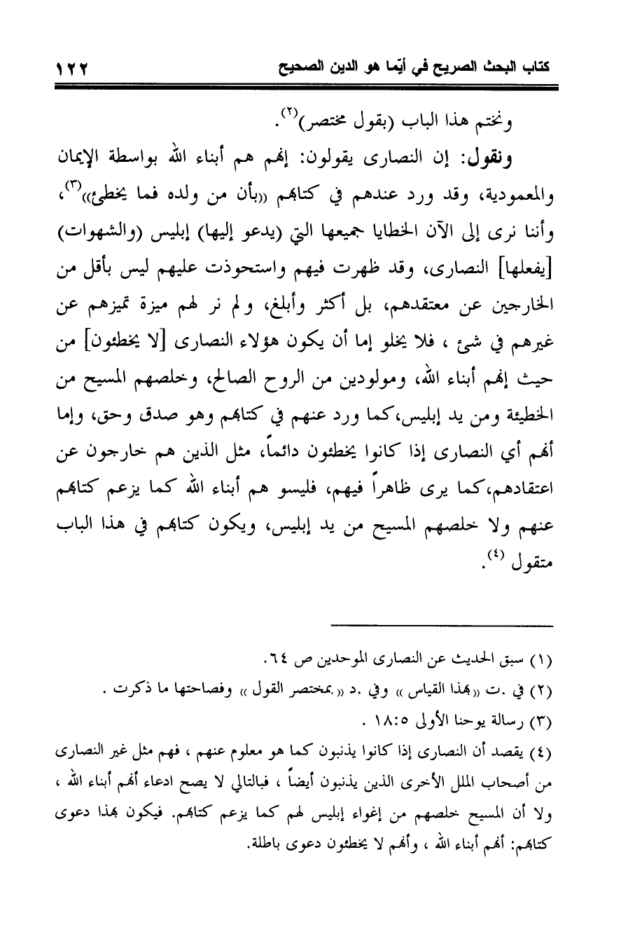 ونقول: إن النصارى يقولون: إنهم هم أبناء الله بواسطة الإيمان والمعمودية، وقد ورد عندهم في كتابهم بأن من ولده فما يخطئ2، وأننا نرى إلى الآن الخطايا جميعها التي يدعو إليها إبليس والشهوات [يفعلها] النصارى، وقد ظهرت فيهم واستحوذت عليهم ليس بأقل من الخارجين عن معتقدهم، بل أكثر وأبلغ، ولم نر لهم ميزة تميزهم عن غيرهم في شئ، فلا يخلو إما أن يكون هؤلاء النصارى [لا يخطئون] من حيث إنهم أبناء الله، ومولودين من الروح الصالح، وخلصهم المسيح من الخطيئة ومن يد إبليس، كما ورد عنهم في كتابهم وهو صدق وحق، وإما أنهم أي النصارى إذا كانوا يخطئون دائماً، مثل الذين هم خارجون عن اعتقادهم، كما يرى ظاهراً فيهم، فليسو هم أبناء الله كما يزعم كتابهم عنهم ولا خلصهم المسيح من يد إبليس، ويكون كتابهم في هذا الباب متقول 3.