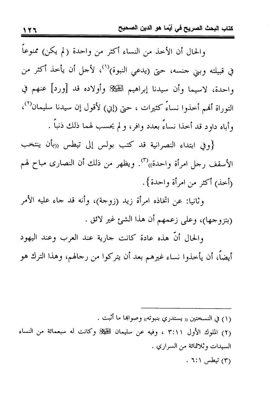 والحال أن الأخذ من النساء أكثر من واحدة (لم يكن) ممنوعاً في قبيلته وبني جنسه، حتى (يدعي النبوة) 1، لأجل أن يأخذ أكثر من واحدة، لاسيما وأن سيدنا إبراهيم عليه السلام وأولاده قد [ورد] عنهم في التوراة أنهم أخذوا نساءً كثيرات، حتى (إني) لأقول إن سيدنا سليمان2، وأباه داود قد أخذا نساءً بعدد وافر، ولم يحسب لهما ذلك ذنباً.