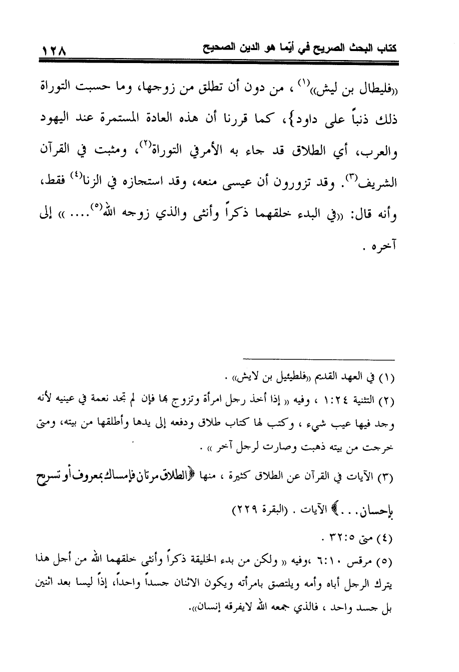 "فليطال بن ليش"1، من دون أن تطلق من زوجها، وما حسبت التوراة ذلك ذنباً على داود} ، كما قررنا أن هذه العادة المستمرة عند اليهود والعرب، أي الطلاق قد جاء به الأمرفي التوراة2، ومثبت في القرآن الشريف3. وقد تزورون أن عيسى منعه، وقد استجازه في الزنا4 فقط، وأنه قال: "في البدء خلقهما ذكراً وأنثى والذي زوجه الله5.... " إلى آخره.