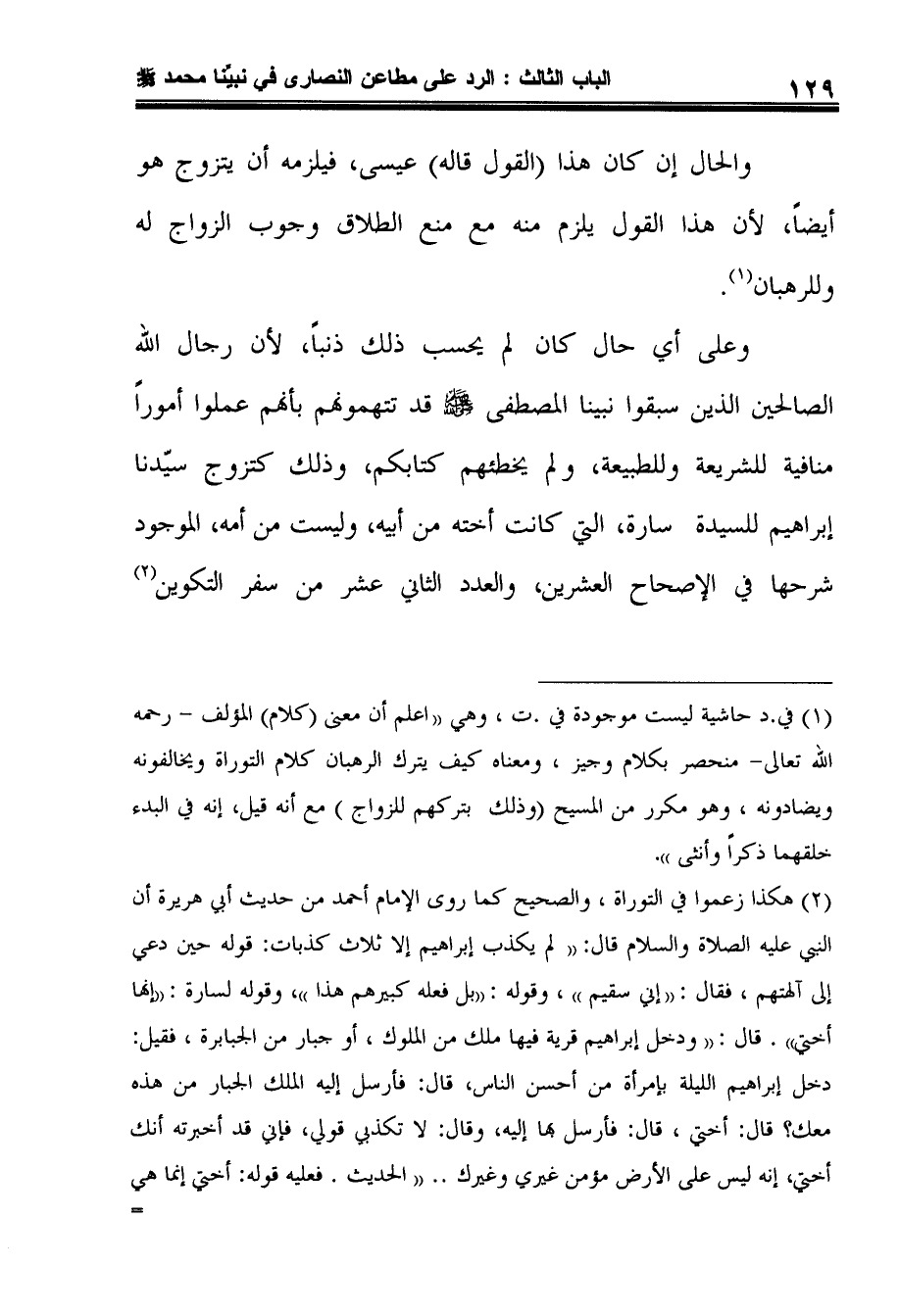 1 في. د حاشية ليست موجودة في. ت، وهي ((اعلم أن معنى (كلام) المؤلف - رحمه الله تعالى- منحصر بكلام وجيز، ومعناه كيف يترك الرهبان كلام التوراة ويخالفونه ويضادونه، وهو مكرر من المسيح (وذلك بتركهم للزواج) مع أنه قيل، إنه في البدء خلقهما ذكراً وأنثى ".