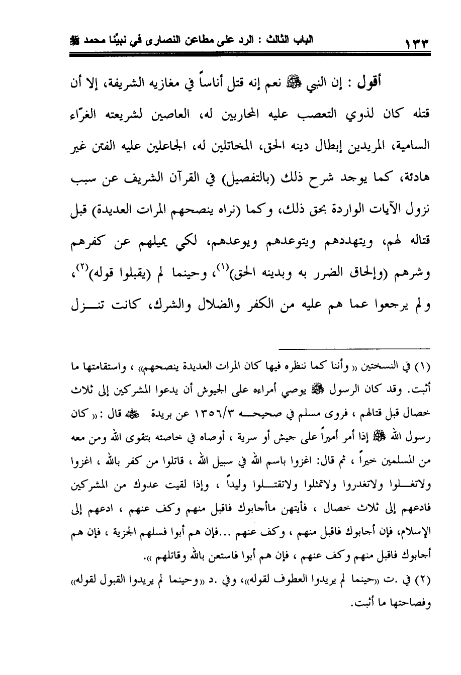 أقول: إن النبي صلى الله عليه وسلم نعم إنه قتل أناساً في مغازيه الشريفة، إلا أن قتله كان لذوي التعصب عليه المحاربين له، العاصين لشريعته الغرّاء السامية، المريدين إبطال دينه الحق، المخاتلين له، الجاعلين عليه الفتن غير هادئة، كما يوجد شرح ذلك (بالتفصيل) في القرآن الشريف عن سبب نزول الآيات الواردة بحق ذلك، وكما (نراه ينصحهم المرات العديدة) قبل قتاله لهم، ويتهددهم ويتوعدهم ويوعدهم، لكي يميلهم عن كفرهم وشرهم (وإلحاق الضرر به وبدينه الحق) 1، وحينما لم (يقبلوا قوله) 2، ولم يرجعوا عما هم عليه من الكفر والضلال والشرك، كانت تنزل