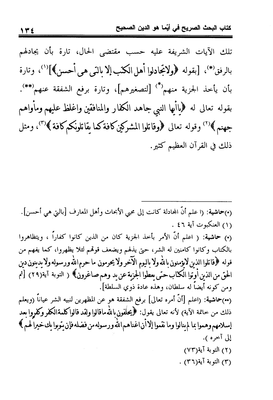 تلك الآيات الشريفة عليه حسب مقتضى الحال، تارة بأن يجادلهم بالرفق*، [بقوله {وَلا تُجَادِلُوا أَهْلَ الْكِتَابِ إِلاَّ بِالَّتِي هِيَ أَحْسَنُ} 1، وتارة بأن يأخذ الجزية منهم* [لتصغيرهم] ، وتارة برفع الشفقة عنهم**. بقوله تعالى له {يَا أَيُّهَا النَّبِيُّ جَاهِدِ الْكُفَّارَ وَالْمُنَافِقِينَ وَاغْلُظْ عَلَيْهِمْ وَمَأْوَاهُمْ جَهَنَّم} 2 وقوله تعالى {وَقَاتِلُوا الْمُشْرِكِينَ كَافَّةً كَمَا يُقَاتِلُونَكُمْ كَافَّةً} 3، ومثل ذلك في القرآن العظيم كثير.