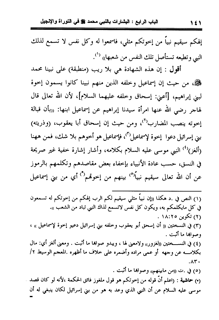 (*) حاشية: (اعلم أنّ قوله من إخوتكم هو قول ملغوز فائق الحكمة، لأنه لو كان قصد موسى عليه السلام عن أن النبي الذي وعد به هو من بني إسرائيل لكان ينبغي له أن يقول عوضاً من إخوتكم، إن منكم يقيم الرب نبياً أو من أسباطكم أو من سلسلتكم أو من نسلكم أو من زرعكم أو من بنيكم أو من مولوديكم، وبحيث إنه قد ترك ذكر هذه السلسلة النازلة لزم أن يكون الحق كما شرح المؤلف بتطبيق العلامات والقرائن الدالة عليه من موسى عليه السلام في هذه الشهادة.