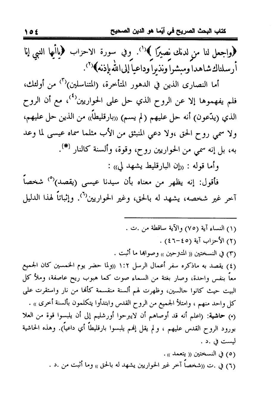 أما النصارى الذين في الدهور المتأخرة، (المتناسلين) 3 من أولئك، فلم يفهموها إلا عن الروح الذي حل على الحواريين4، مع أن الروح الذي (يدّعون) أنه حل عليهم (لم يسم) "بارقليطاً" من الذين حل عليهم، ولا سمي روح الحق، ولا دعي المنبثق من الأب مثلما سماه عيسى لما وعد به، بل إنه سمي من الحواريين روح، وقوة، وألسنة كالنار*.