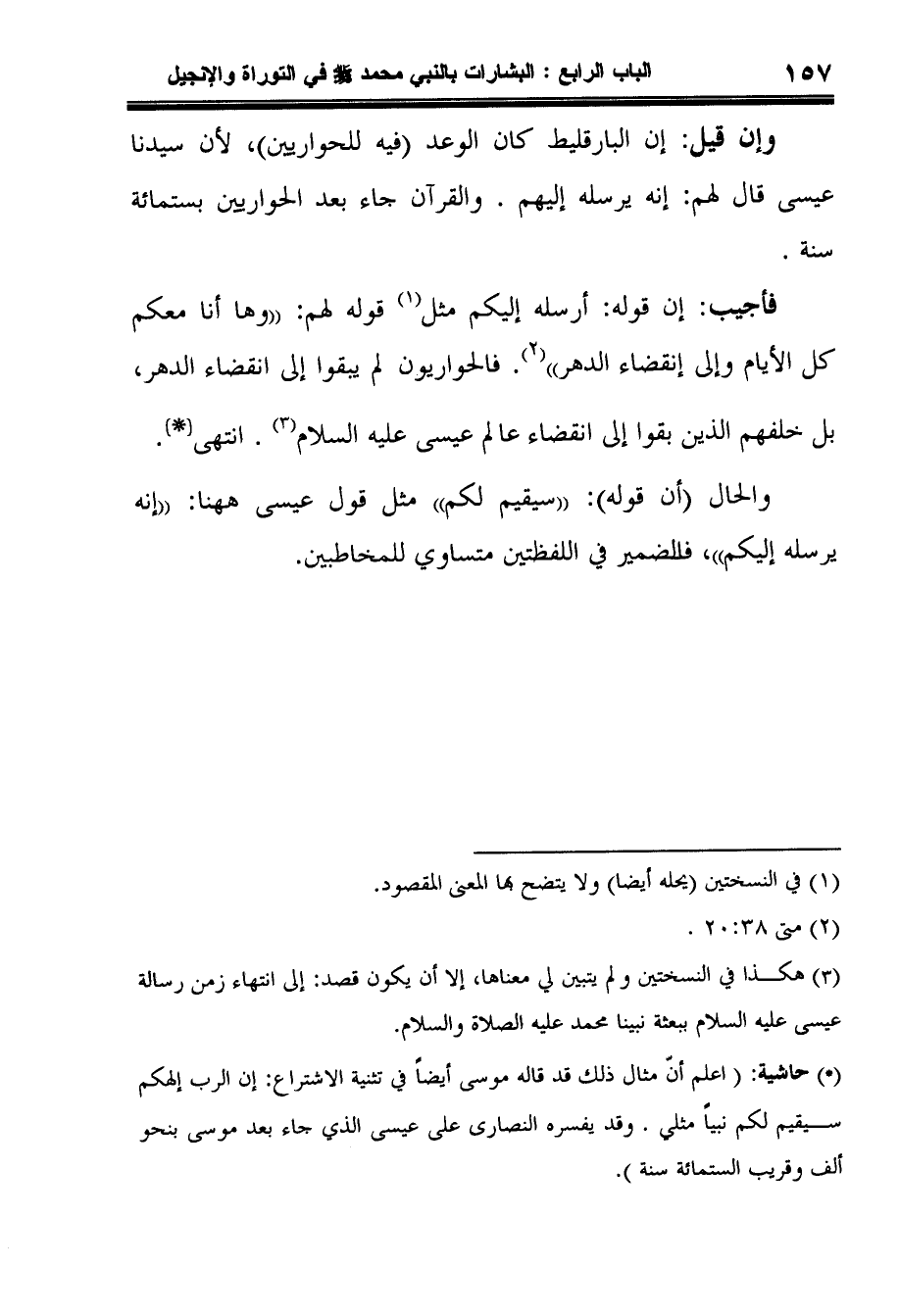 فأجيب: إن قوله: أرسله إليكم مثل1 قوله لهم: "وها أنا معكم كل الأيام وإلى إنقضاء الدهر"2. فالحواريون لم يبقوا إلى انقضاء الدهر، بل خلفهم الذين بقوا إلى انقضاء عالم عيسى عليه السلام3. انتهى*.
