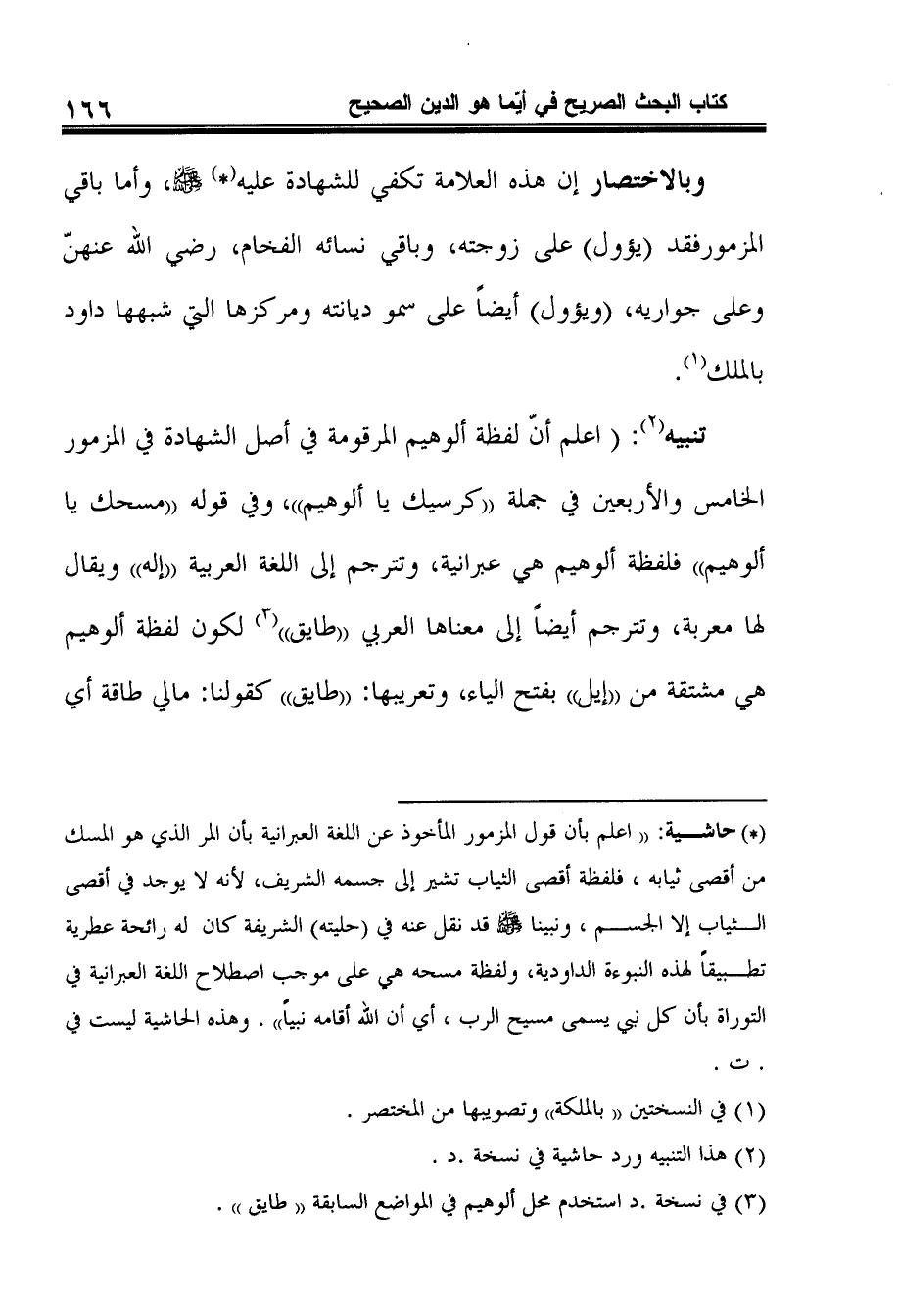 تنبيه2: (اعلم أنّ لفظة ألوهيم المرقومة في أصل الشهادة في المزمور الخامس والأربعين في جملة "كرسيك يا ألوهيم"، وفي قوله "مسحك يا ألوهيم" فلفظة ألوهيم هي عبرانية، وتترجم إلى اللغة العربية "إله" ويقال لها معربة، وتترجم أيضاً إلى معناها العربي "طايق"3 لكون لفظة ألوهيم هي مشتقة من "إيل" بفتح الياء، وتعريبها: "طايق" كقولنا: مالي طاقة أي