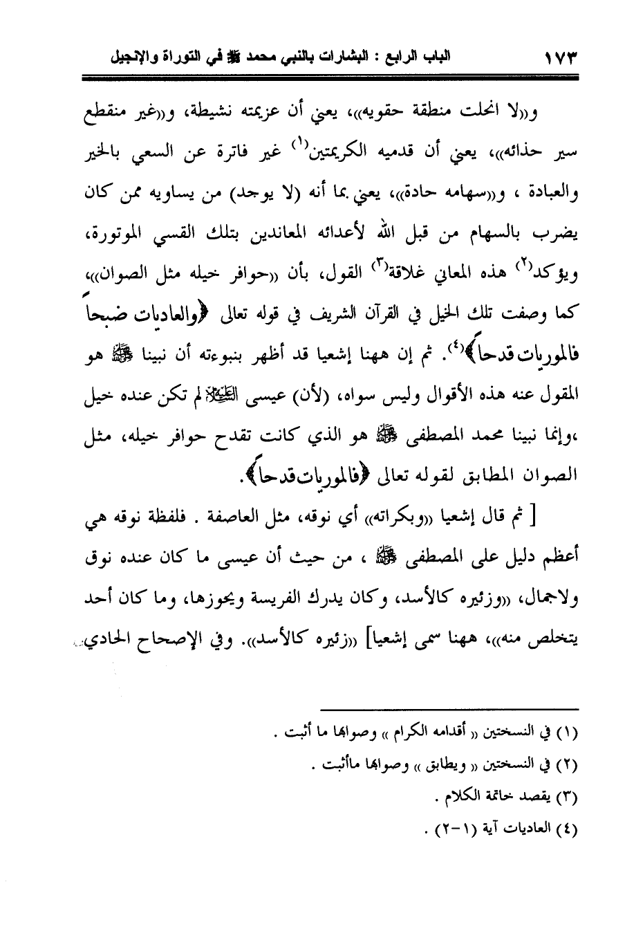و"لا انحلت منطقة حقويه"، يعني أن عزيمته نشيطة، و"غير منقطع سير حذائه"، يعني أن قدميه الكريمتين1 غير فاترة عن السعي بالخير والعبادة، و"سهامه حادة"، يعني بما أنه (لا يوجد) من يساويه ممن كان يضرب بالسهام من قبل الله لأعدائه المعاندين بتلك القسي الموتورة، ويؤكد2 هذه المعاني غلاقة3 القول، بأن "حوافر خيله مثل الصوان"، كما وصفت تلك الخيل في القرآن الشريف في قوله تعالى {وَالْعَادِيَاتِ ضَبْحاً فَالْمُورِيَاتِ قَدْحاً} 4. ثم إن ههنا إشعيا قد أظهر بنبوءته أن نبينا صلى الله عليه وسلم هو المقول عنه هذه الأقوال وليس سواه، (لأن) عيسى عليه السلاملم تكن عنده خيل، وإنما نبينا محمد المصطفى صلى الله عليه وسلم هو الذي كانت تقدح حوافر خيله، مثل الصوان المطابق لقوله تعالى {فَالْمُورِيَاتِ قَدْحاً} .