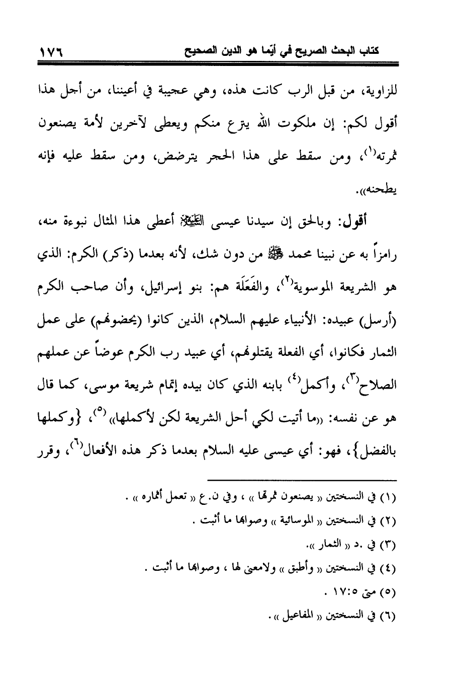 أقول: وبالحق إن سيدنا عيسىعليه السلامأعطى هذا المثال نبوءة منه، رامزاً به عن نبينا محمد صلى الله عليه وسلم من دون شك، لأنه بعدما (ذكر) الكرم: الذي هو الشريعة الموسوية2، والفَعَلَة هم: بنو إسرائيل، وأن صاحب الكرم (أرسل) عبيده: الأنبياء عليهم السلام، الذين كانوا (يحضونهم) على عمل الثمار فكانوا، أي الفعلة يقتلونهم، أي عبيد رب الكرم عوضاً عن عملهم الصلاح3، وأكمل4 بابنه الذي كان بيده إتمام شريعة موسى، كما قال هو عن نفسه: "ما أتيت لكي أحل الشريعة لكن لأكملها"5، {وكملها بالفضل} ، فهو: أي عيسى عليه السلام بعدما ذكر هذه الأفعال6، وقرر