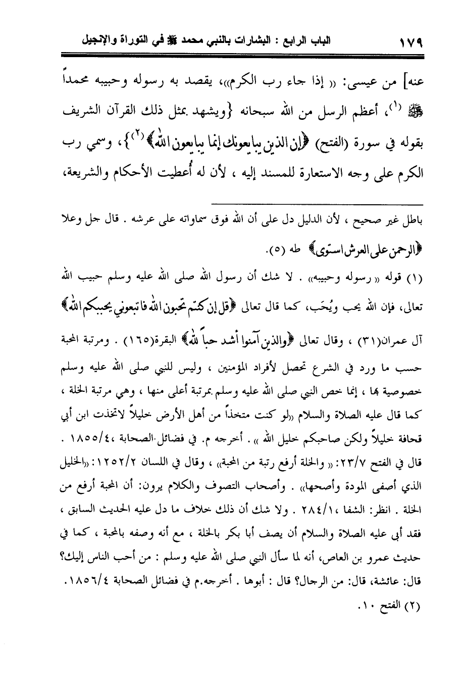 1 قوله "رسوله وحبيبه". لا شك أن رسول الله صلى الله عليه وسلم حبيب الله تعالى، فإن الله يحب ويُحَب، كما قال تعالى {قُلْ إِنْ كُنْتُمْ تُحِبُّونَ اللَّهَ فَاتَّبِعُونِي يُحْبِبْكُمُ اللَّه} آل عمران (31) ، وقال تعالى {وَالَّذِينَ آمَنُوا أَشَدُّ حُبّاً لِلَّه} البقرة (165) . ومرتبة المحبة حسب ما ورد في الشرع تحصل لأفراد المؤمنين، وليس للنبي صلى الله عليه وسلم خصوصية بها، إنما خص النبي صلى الله عليه وسلم بمرتبة أعلى منها، وهي مرتبة الخلة، كما قال عليه الصلاة والسلام "لو كنت متخذاً من أهل الأرض خليلاً لاتخذت ابن أبي قحافة خليلاً ولكن صاحبكم خليل الله". أخرجه م. في فضائل الصحابة،4/1855. قال في الفتح 7/23: "والخلة أرفع رتبة من المحبة"، وقال في اللسان 2/1252: "الخليل الذي أصفى المودة وأصحها". وأصحاب التصوف والكلام يرون: أن المحبة أرفع من الخلة. انظر: الشفا،1/284. ولا شك أن ذلك خلاف ما دل عليه الحديث السابق، فقد أبى عليه الصلاة والسلام أن يصف أبا بكر بالخلة، مع أنه وصفه بالمحبة، كما في حديث عمرو بن العاص، أنه لما سأل النبي صلى الله عليه وسلم: "من أحب الناس إليك؟ قال: عائشة، قال: من الرجال؟ قال: أبوها". أخرجه. م في فضائل الصحابة 4/1856.