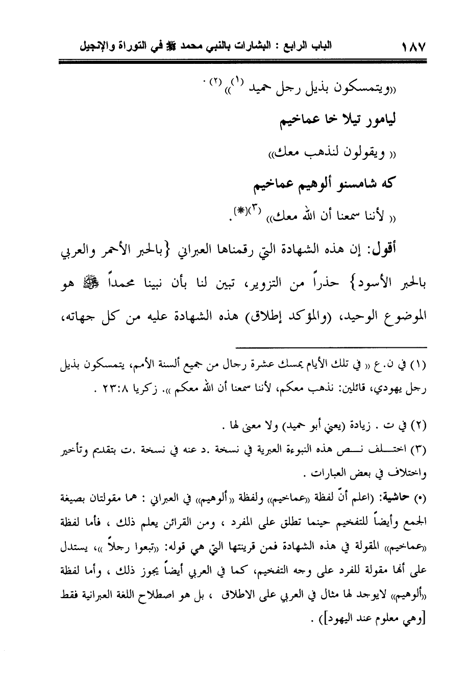 * حاشية: اعلم أنّ لفظة عماخيم ولفظة ألوهيم في العبراني: هما مقولتان بصيغة الجمع وأيضاً للتفخيم حينما تطلق على المفرد، ومن القرائن يعلم ذلك، فأما لفظة عماخيم المقولة في هذه الشهادة فمن قرينتها التي هي قوله: تبعوا رجلاً، يستدل على أنها مقولة للفرد على وجه التفخيم، كما في العربي أيضاً يجوز ذلك، وأما لفظة ألوهيم لايوجد لها مثال في العربي على الاطلاق، بل هو اصطلاح اللغة العبرانية فقط [وهي معلوم عند اليهود] .