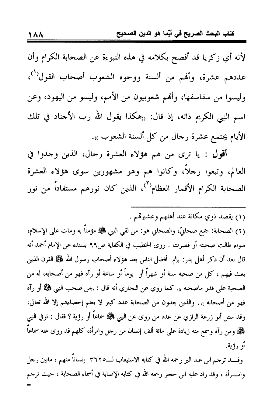 لأنه أي زكريا قد أفصح بكلامه في هذه النبوءة عن الصحابة الكرام وأن عددهم عشرة، وأنهم من ألسنة ووجوه الشعوب أصحاب القول1، وليسوا من سفاسفها، وأنهم شعوبيون من الأمم، وليسو من اليهود، وعن اسم النبي الكريم ذاته، إذ قال: ((هكذا يقول الله رب الأجناد في تلك الأيام يجتمع عشرة رجال من كل ألسنة الشعوب)) .