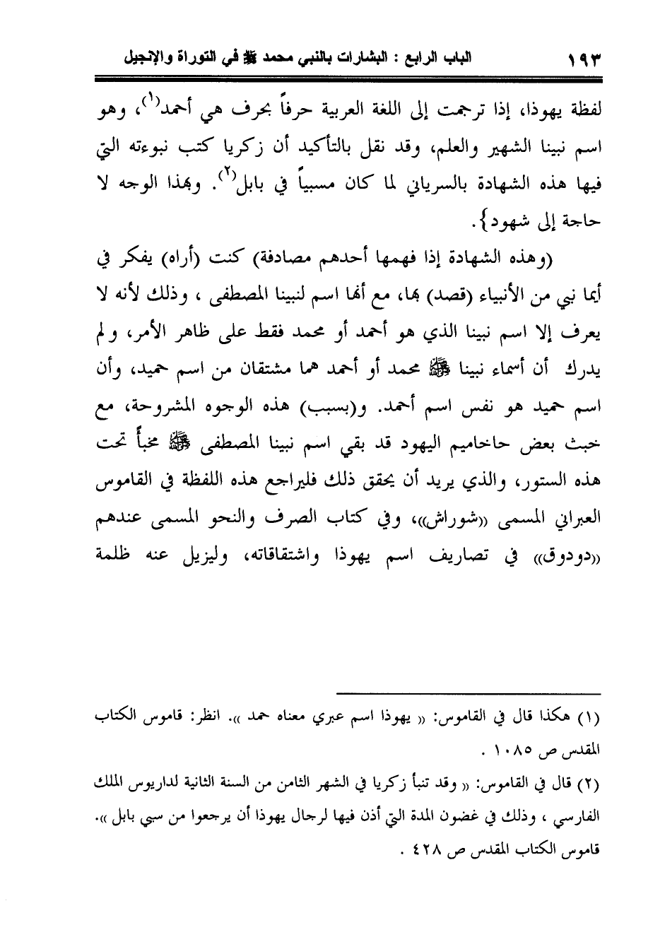(وهذه الشهادة إذا فهمها أحدهم مصادفة) كنت (أراه) يفكر في أيما نبي من الأنبياء (قصد) بها، مع أنها اسم لنبينا المصطفى، وذلك لأنه لا يعرف إلا اسم نبينا الذي هو أحمد أو محمد فقط على ظاهر الأمر، ولم يدرك أن أسماء نبينا صلى الله عليه وسلم محمد أو أحمد هما مشتقان من اسم حميد، وأن اسم حميد هو نفس اسم أحمد. و (بسبب) هذه الوجوه المشروحة، مع خبث بعض حاخاميم اليهود قد بقي اسم نبينا المصطفى صلى الله عليه وسلم مخبأً تحت هذه الستور، والذي يريد أن يحقق ذلك فليراجع هذه اللفظة في القاموس العبراني المسمى ((شوراش)) ، وفي كتاب الصرف والنحو المسمى عندهم ((دودوق)) في تصاريف اسم يهوذا واشتقاقاته، وليزيل عنه ظلمة