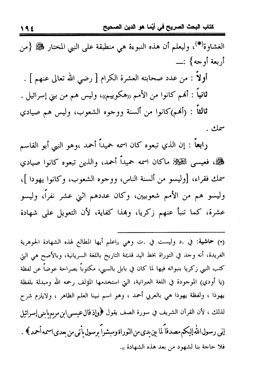 * حاشية: في. د وليست في. ت وهي اعلم أيها المطالع لهذه الشهادة الجوهرية الفريدة، أنه وجد في التوراة بخط اليد قديمة التاريخ باللغة السريانية، وبالأصح هي التي كتب النبي زكريا بنبواته فيها لما كان في بابل بالسبي، مكتوباً بصراحة عوضاً عن لفظة يا أودي الموجودة في اللغة العبرانية، التي استخدمها المؤلف رحمه الله ومبدلة بلفظة يهوذا، ولفظة يهوذا هي بالعربي أحمد، وهو اسم نبينا العلم الظاهر، ولايلزم شرح لذلك، لأن القرآن الشريف في سورة الصف يقول: {وَإِذْ قَالَ عِيسَى ابْنُ مَرْيَمَ يَا بَنِي إِسْرائيلَ إِنِّي رَسُولُ اللَّهِ إِلَيْكُمْ مُصَدِّقاً لِمَا بَيْنَ يَدَيَّ مِنَ التَّوْرَاةِ وَمُبَشِّراً بِرَسُولٍ يَأْتِي مِنْ بَعْدِي اسْمُهُ أَحْمَدُ} . فلا حاجة بنا لشهود من بعد هذه الشهادة.