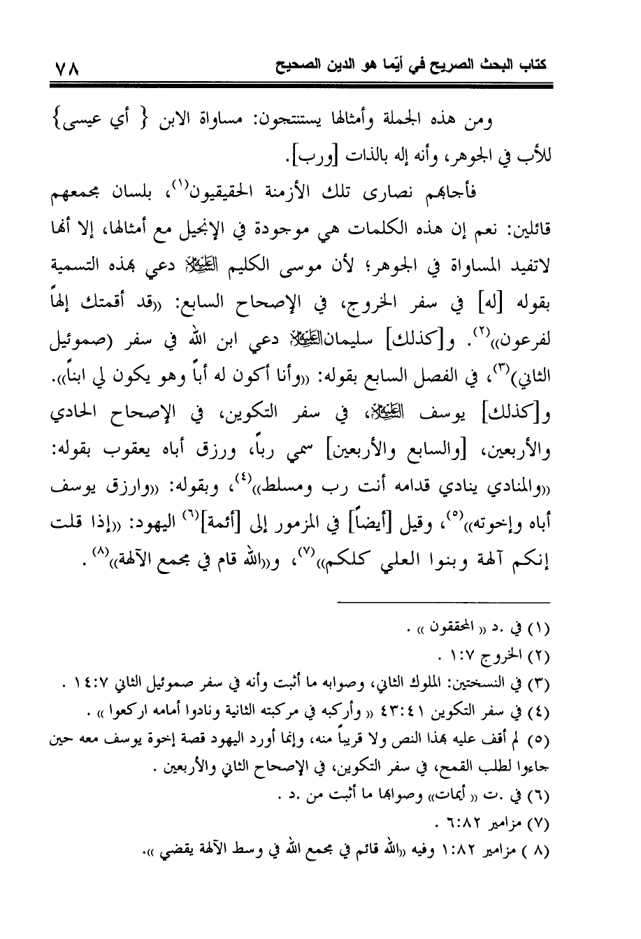 فأجابهم نصارى تلك الأزمنة الحقيقيون1، بلسان مجمعهم قائلين: نعم إن هذه الكلمات هي موجودة في الإنجيل مع أمثالها، إلا أنها لاتفيد المساواة في الجوهر؛ لأن موسى الكليم دعي بهذه التسمية بقوله [له] في سفر الخروج، في الإصحاح السابع: قد أقمتك إلهاًلفرعون2. و [كذلك] سليمان دعي ابن الله في سفر صموئيل الثاني3، في الفصل السابع بقوله: وأنا أكون له أباً وهو يكون لي ابناً. و [كذلك] يوسف، في سفر التكوين، في الإصحاح الحادي والأربعين، [والسابع والأربعين] سمي رباً، ورزق أباه يعقوب بقوله: والمنادي ينادي قدامه أنت رب ومسلط4، وبقوله: وارزق يوسف أباه وإخوته5، وقيل [أيضاً] في المزمور إلى [أئمة] 6 اليهود: إذا قلت إنكم آلهة وبنوا العلي كلكم7،والله قام في مجمع الآلهة8.