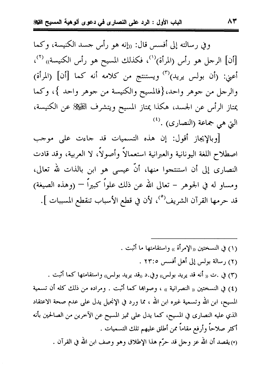 وفي رسالته إلى أفسس قال: إنه هو رأس جسد الكنيسة، وكما [أن] الرجل هو رأس المرأة1، فكذلك المسيح هو رأس الكنيسة 2، أعني: أن بولس يريد3 ويستنتج من كلامه أنه كما [أن] المرأة والرجل من جوهر واحد، (فالمسيح والكنيسة من جوهر واحد) ، وكما يمتاز الرأس عن الجسد، هكذا يمتاز المسيح ويتشرفعن الكنيسة، التي هي جماعة النصارى.4