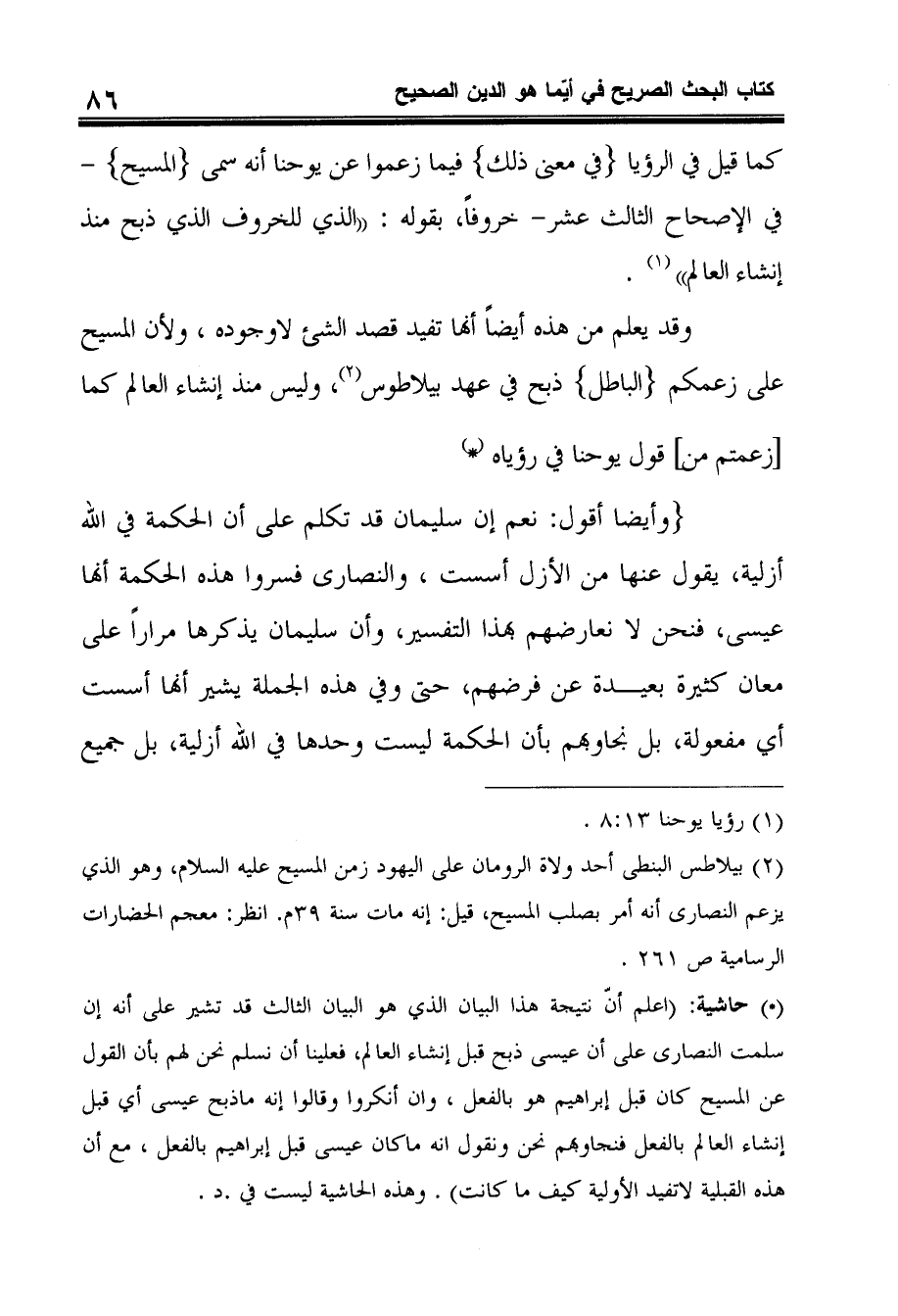 (وأيضا أقول: نعم إن سليمان قد تكلم على أن الحكمة في الله أزلية، يقول عنها من الأزل أسست، والنصارى فسروا هذه الحكمة أنها عيسى، فنحن لا نعارضهم بهذا التفسير، وأن سليمان يذكرها مراراً على معان كثيرة بعيدة عن فرضهم، حتى وفي هذه الجملة يشير أنها أسست أي مفعولة، بل نجاوبهم بأن الحكمة ليست وحدها في الله أزلية، بل جميع