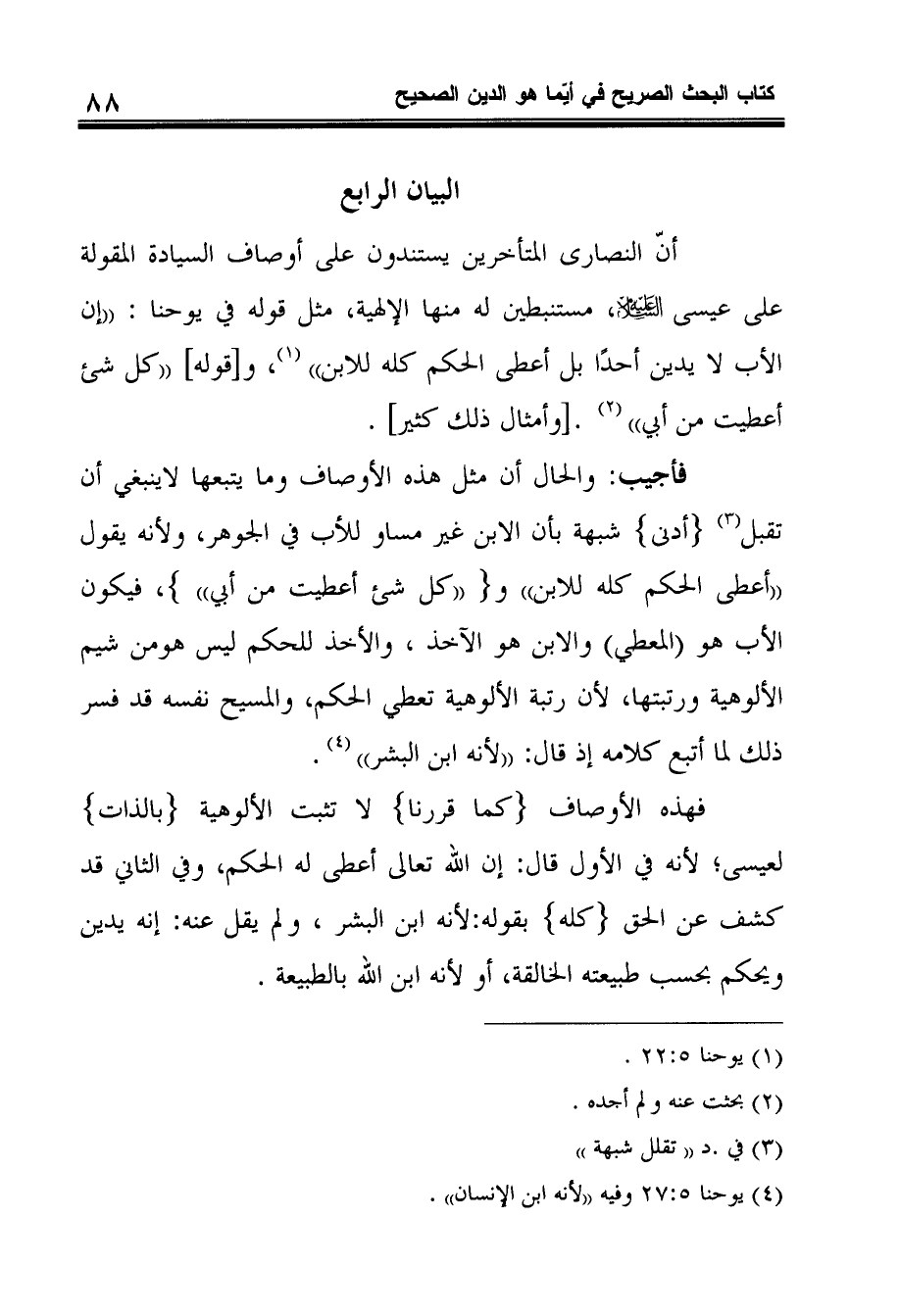 فأجيب: والحال أن مثل هذه الأوصاف وما يتبعها لاينبغي أن تقبل3 (أدنى) شبهة بأن الابن غير مساو للأب في الجوهر، ولأنه يقول أعطى الحكم كله للابن و (كل شئ أعطيت من أبي) ، فيكون الأب هو المعطي والابن هو الآخذ، والأخذ للحكم ليس هومن شيم الألوهية ورتبتها، لأن رتبة الألوهية تعطي الحكم، والمسيح نفسه قد فسر ذلك لما أتبع كلامه إذ قال: لأنه ابن البشر 4.