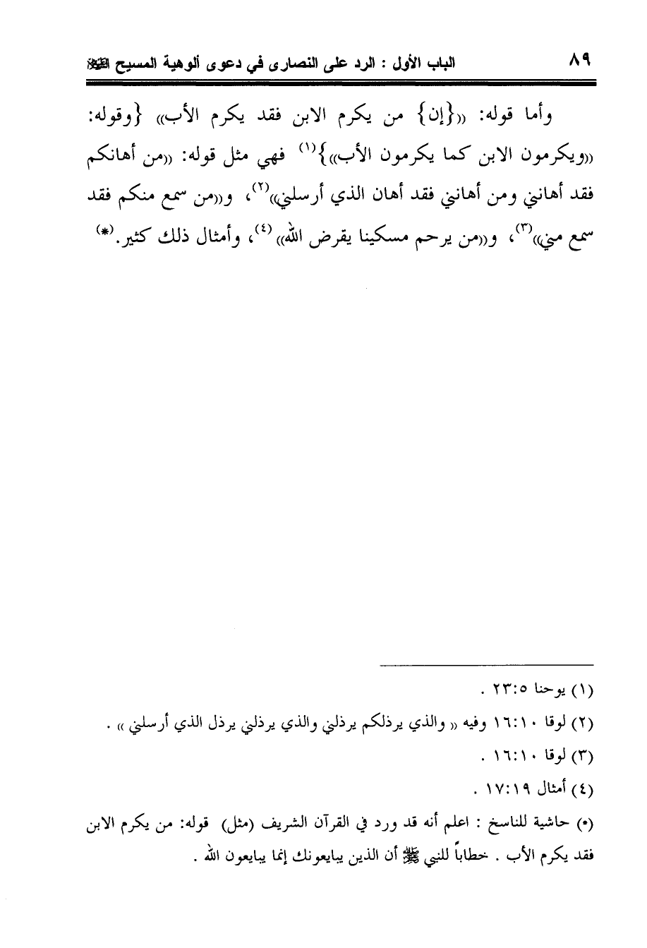 وأما قوله: (إن) من يكرم الابن فقد يكرم الأب (وقوله: ويكرمون الابن كما يكرمون الأب) 1 فهي مثل قوله: من أهانكم فقد أهانني ومن أهانني فقد أهان الذي أرسلني2،ومن سمع منكم فقد سمع مني3،ومن يرحم مسكينا يقرض الله 4، وأمثال ذلك كثير.5