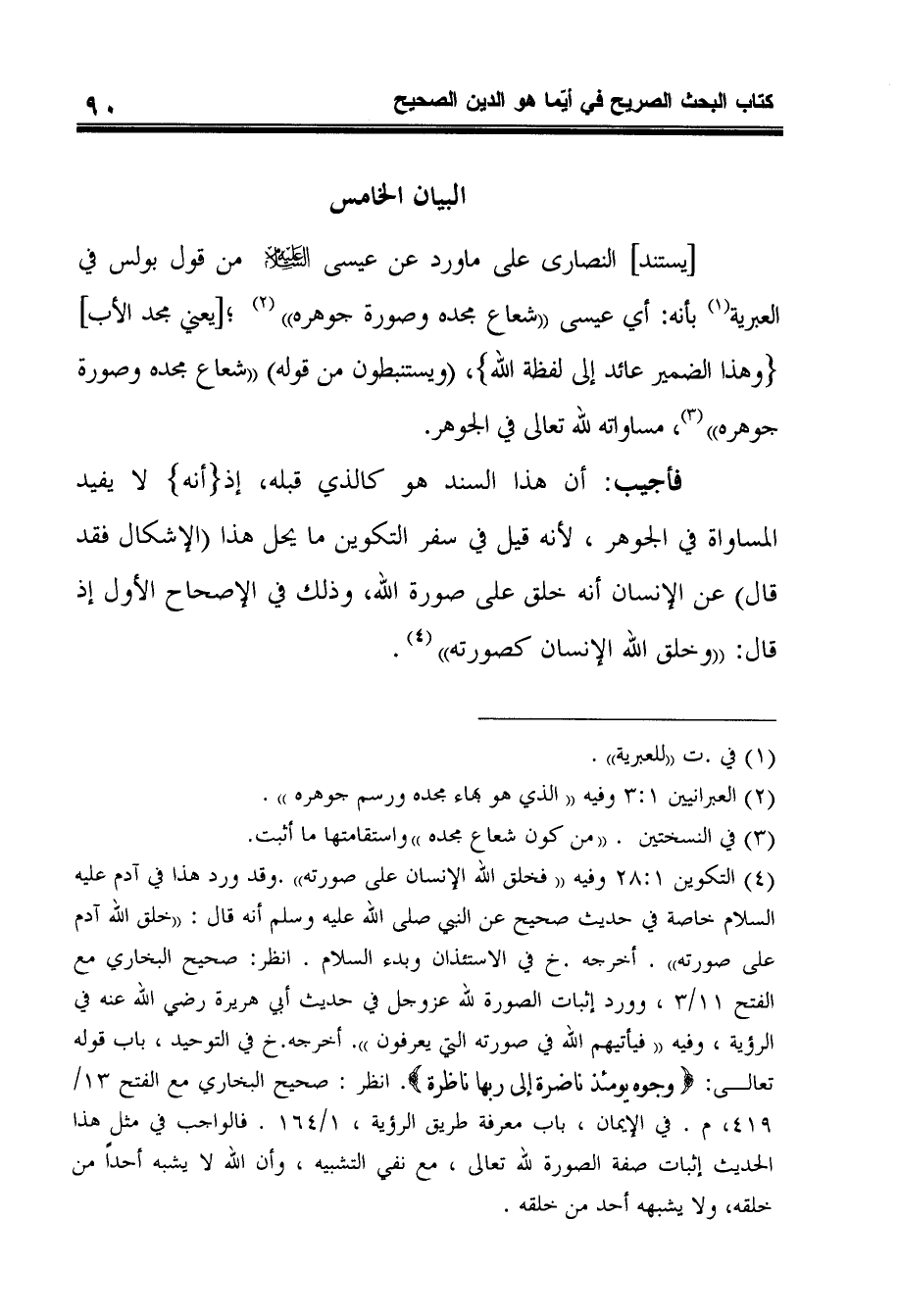 فأجيب: أن هذا السند هو كالذي قبله، إذ (أنه) لا يفيد المساواة في الجوهر، لأنه قيل في سفر التكوين ما يحل هذا الإشكال فقد قال عن الإنسان أنه خلق على صورة الله، وذلك في الإصحاح الأول إذ قال: وخلق الله الإنسان كصورته 4.