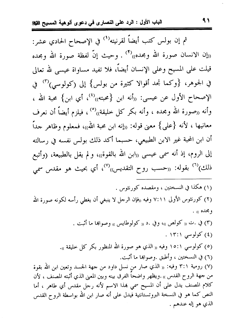 7 رومية 3:1 وفيه: الذي صار من نسل داود من جهة الجسد وتعين ابن الله بقوة من جهة الروح القدس. ويظهر واضحاً الفرق بينه وبين المعنى الذي أثبته المصنف، لأن كلام المصنف يدل على أن المسيح سمي بهذا الاسم لأنه رجل مقدس أي طاهر، أما النص كما هو في النسخة البروتستانتية فيدل على أنه صار ابن الله بواسطة الروح القدس الذي هو إله عندهم.