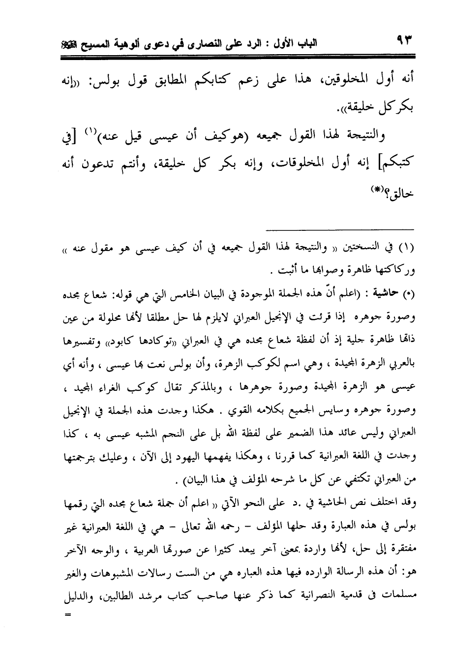 2 حاشية: اعلم أنّ هذه الجملة الموجودة في البيان الخامس التي هي قوله: شعاع مجده وصورة جوهرهإذا قرئت في الإنجيل العبراني لايلزم لها حل مطلقا لأنها محلولة من عين ذاتها ظاهرة جلية إذ أن لفظة شعاع مجده هي في العبراني توكادها كابود وتفسيرها بالعربي الزهرة المجيدة، وهي اسم لكوكب الزهرة، وأن بولس نعت بها عيسى، وأنه أي عيسى هو الزهرة المجيدة وصورة جوهرها، وبالمذكر تقال كوكب الغراء المجيد، وصورة جوهره وسايس الجميع بكلامه القوي. هكذا وجدت هذه الجملة في الإنجيل العبراني وليس عائد هذا الضمير على لفظة الله بل على النجم المشبه عيسى به، كذا وجدت في اللغة العبرانية كما قررنا، وهكذا يفهمها اليهود إلى الآن، وعليك بترجمتها من العبراني تكتفي عن كل ما شرحه المؤلف في هذا البيان.