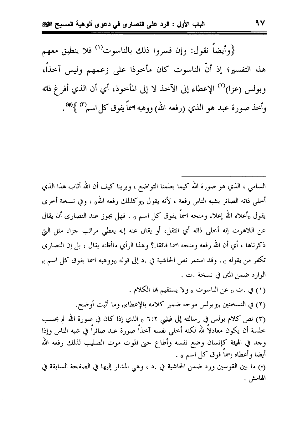 (وأيضاً نقول: وإن فسروا ذلك بالناسوت1 فلا ينطبق معهم هذا التفسير؛ إذ أنّ الناسوت كان مأخوذا على زعمهم وليس آخذاً، وبولس عزا2 الإعطاء إلى الآخذ لا إلى المأخوذ، أي أن الذي أفرغ ذاته وأخذ صورة عبد هو الذي رفعه الله ووهبه اسماً يفوق كل اسم3) 4.