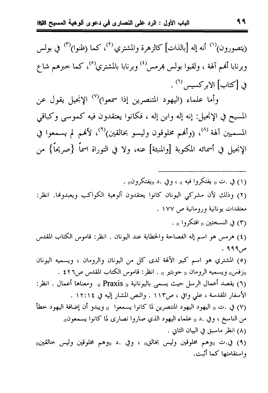 وأما علماء اليهود المتنصرين إذا سمعوا7 الإنجيل يقول عن المسيح في الإنجيل: إنه إله وابن إله، فكانوا يعتقدون فيه كموسى وكباقي المسميين آلهة 8، وأنهم مخلوقون وليسو بخالقين9، لأنهم لم يسمعوا في الإنجيل في أسمائه المكتوبة [والمنبئة] عنه، ولا في التوراة اسماً (صريحاً) من