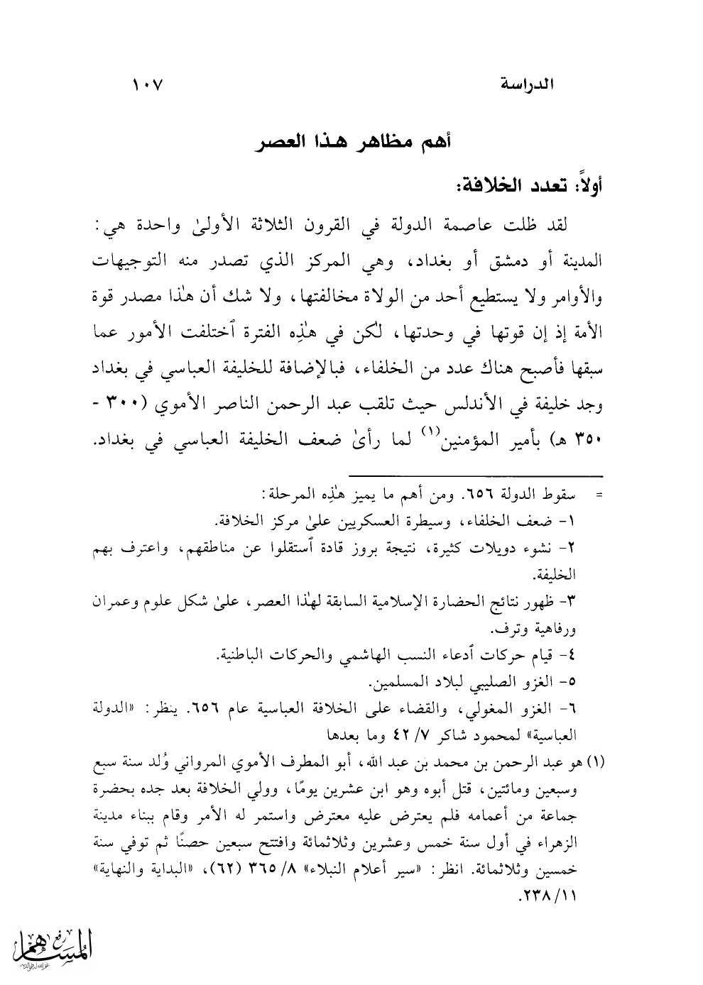 لقد ظلت عاصمة الدولة في القرون الثلاثة الأولى واحدة هي: المدينة أو دمشق أو بغداد، وهي المركز الذي تصدر منه التوجيهات والأوامر ولا يستطيع أحد من الولاة مخالفتها، ولا شك أن هذا مصدر قوة الأمة إذ إن قوتها في وحدتها، لكن في هذِه الفترة اختلفت الأمور عما سبقها فأصبح هناك عدد من الخلفاء، فبالإضافة للخليفة العباسي في بغداد وجد خليفة في الأندلس حيث تلقب عبد الرحمن الناصر الأموي (300 - 350 هـ) بأمير المؤمنين (¬1) لما رأى ضعف الخليفة العباسي في بغداد.