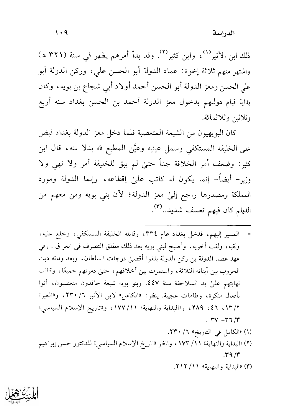 ذلك ابن الأثير (¬1)، وابن كثير (¬2). وقد بدأ أمرهم يظهر في سنة (321 هـ) واشتهر منهم ثلاثة إخوة: عماد الدولة أبو الحسن علي، وركن الدولة أبو علي الحسن ومعز الدولة أبو الحسن أحمد أولاد أبي شجاع بن بويه، وكان بداية قيام دولتهم بدخول معز الدولة أحمد بن الحسن بغداد سنة أربع وثلاثين وثلاثمائة.