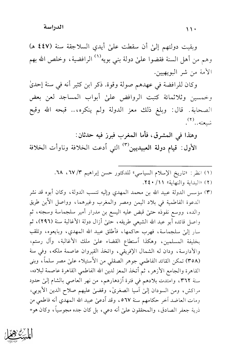 (¬3) مؤسس الدولة عبيد الله بن محمد المهدي وإليه تنسب الدولة، وكان أبوه قد نشر الدعوة الفاطمية في بلاد اليمن ومصر والمغرب وغيرهما، وواصل الابن طريق والده، ووسع نفوذه حتى قبض عليه اليسع بن مدرار أمير سلجماسة وسجنه، ثم واصل قائده أبو عبد الله الشيعي طريقه، حتى أزال دولة الأغالبة سنة (296)، ثم سار إلى سلجماسة، فهرب حاكمها، فأطلق عبيد الله المهدي، وبايعوه، وتلقب بخليفة المسلمين، وهكذا استطاع القضاء على ملك الأغالبة، وآل رستم، والأدارسة، ودان له الشمال الإفريقي، واتخذ القيروان عاصمة ملكه، وفي سنة (358) تمكن القائد الفاطمي جوهر الصقلي من الاستيلاء على مصر سلماً، وبنى القاهرة والجامع الأزهر، ثم اتخذ المعز لدين الله الفاطمي القاهرة عاصمة لبلاده، سنة 362، وامتدت بلادهم في فترة ازدهارهم، من نهر العاصي بالشام إلى حدود مراكش، ومن السودان إلى آسيا الصغرى، وقضى عليهم صلاح الدين الأيوبي، ومات العاضد آخر حكامهم سنة 567، وقد ادعى عبيد الله المهدي أنه فاطمي من ذرية جعفر الصادق، والمحققون على أنه دعي، بل كان جده مجوسياً، وكان هو =
