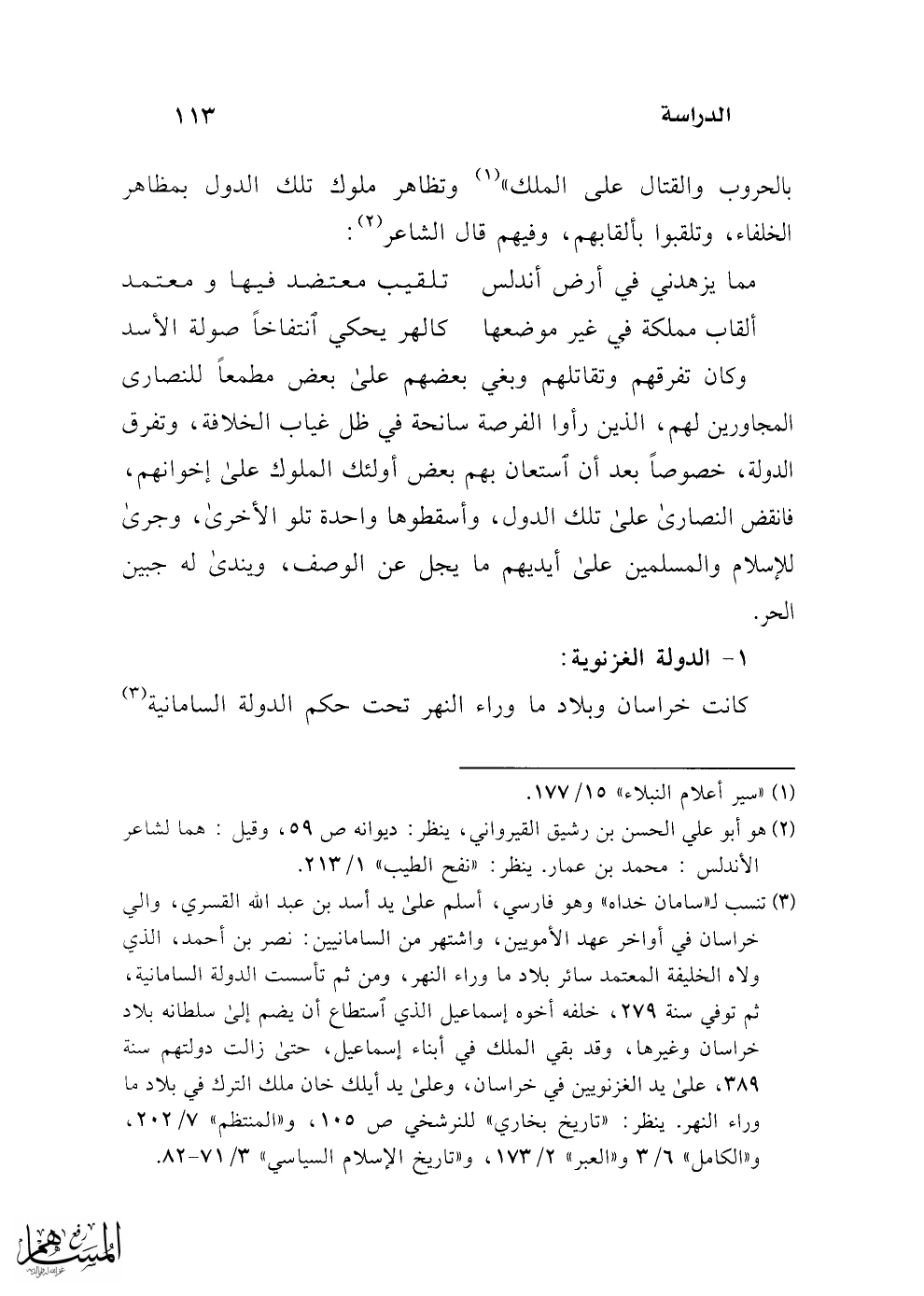 (¬3) تنسب لـ"سامان خداه" وهو فارسي، أسلم على يد أسد بن عبد الله القسري، والي خراسان في أواخر عهد الأمويين، واشتهر من السامانيين: نصر بن أحمد، الذي ولاه الخليفة المعتمد سائر بلاد ما وراء النهر، ومن ثم تأسست الدولة السامانية، ثم توفي سنة 279، خلفه أخوه إسماعيل الذي استطاع أن يضم إلى سلطانه بلاد خراسان وغيرها، وقد بقي الملك في أبناء إسماعيل، حتى زالت دولتهم سنة 389، على يد الغزنويين في خراسان، وعلى يد أيلك خان ملك الترك في بلاد ما وراء النهر. ينظر: "تاريخ بخاري" للنرشخي ص 105، و"المنتظم" 7/ 202، و"الكامل" 6/ 3 و"العبر" 2/ 173، و"تاريخ الإسلام السياسي" 3/ 71 - 82.