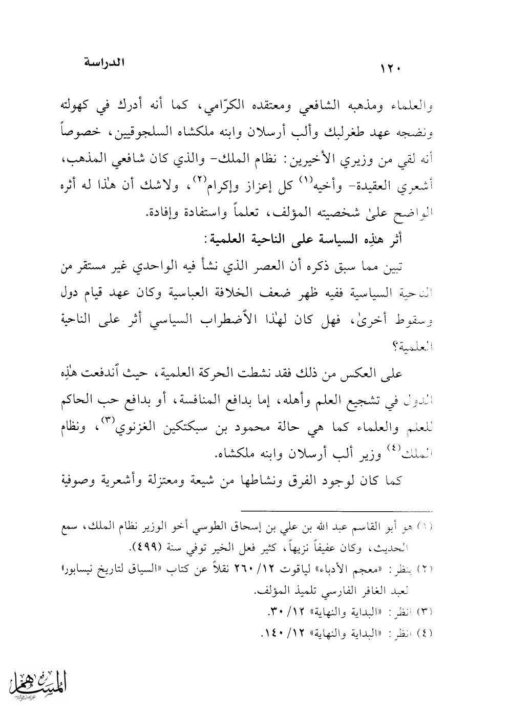 والعلماء ومذهبه الشافعي ومعتمده الكرّامي، كما أنه أدرك في كهولته ونضجه عهد طغرلبك وألب أرسلان وابنه ملكشاه السلجوقيين، خصوصاً أنه لقي من وزيري الأخيرين: نظام الملك -والذي كان شافعي المذهب، أشعري العقيدة- وأخيه (¬1) كل إعزاز وإكرام (¬2)، ولا شك أن هذا له أثره الواضح على شخصيته المؤلف، تعلماً واستفادة وإفادة.