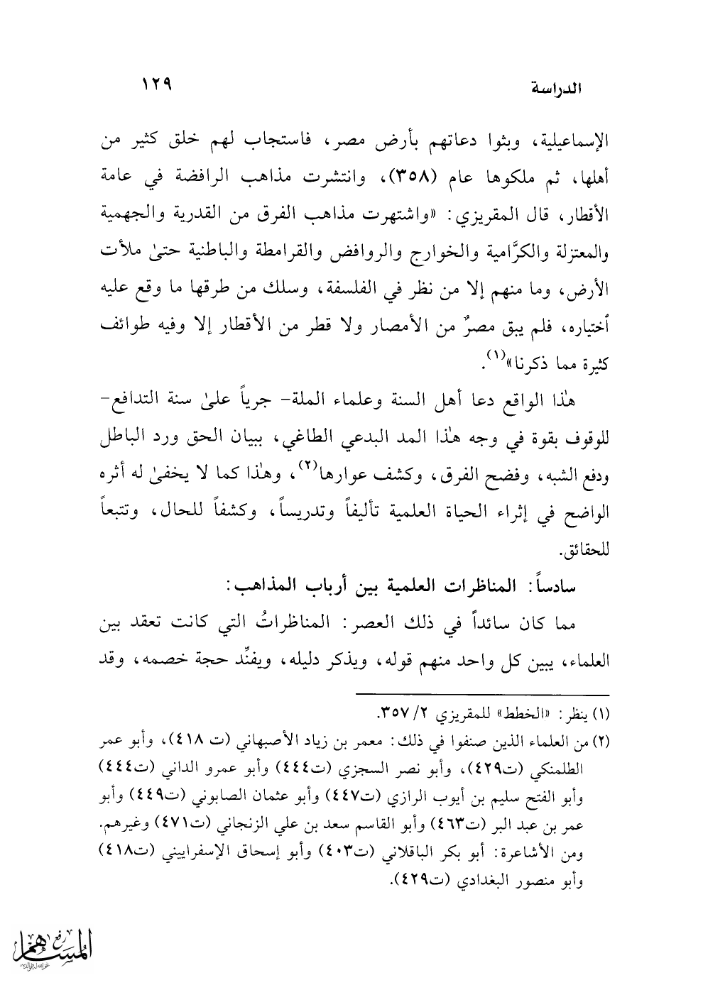 الإسماعيلية، وبثوا دعاتهم بأرض مصر، فاستجاب لهم خلق كثير من أهلها، ثم ملكوها عام (358)، وانتشرت مذاهب الرافضة في عامة الأقطار، قال المقريزي: "واشتهرت مذاهب الفرق من القدرية والجهمية والمعتزلة والكرَّامية والخوارج والروافض والقرامطة والباطنية حتى ملأت الأرض، وما منهم إلا من نظر في الفلسفة، وسلك من طرقها ما وقع عليه اختياره، فلم يبق مصر من الأمصار ولا قطر من الأقطار إلا وفيه طوائف كثيرة مما ذكرنا" (¬1).