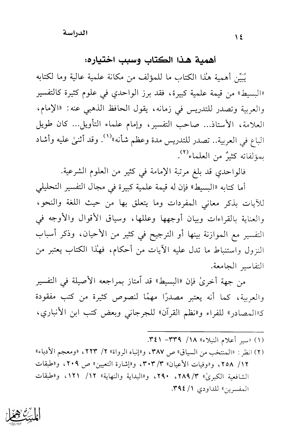 يُبَيِّن أهمية هذا الكتاب ما للمؤلف من مكانة علمية عالية وما لكتابه "البسيط" من قيمة علمية كبيرة، فقد برز الواحدي في علوم كثيرة كالتفسير والعربية وتصدر للتدريس في زمانه، يقول الحافظ الذهبي عنه: "الإِمام، العلامة، الأستاذ ... صاحب التفسير، وإمام علماء التأويل ... كان طويل الباع في العربية .. تصدر للتدريس مدة وعظم شأنه" (¬1). وقد أثنا عليه وأشاد بمؤلفاته كثيرٌ من العلماء (¬2).