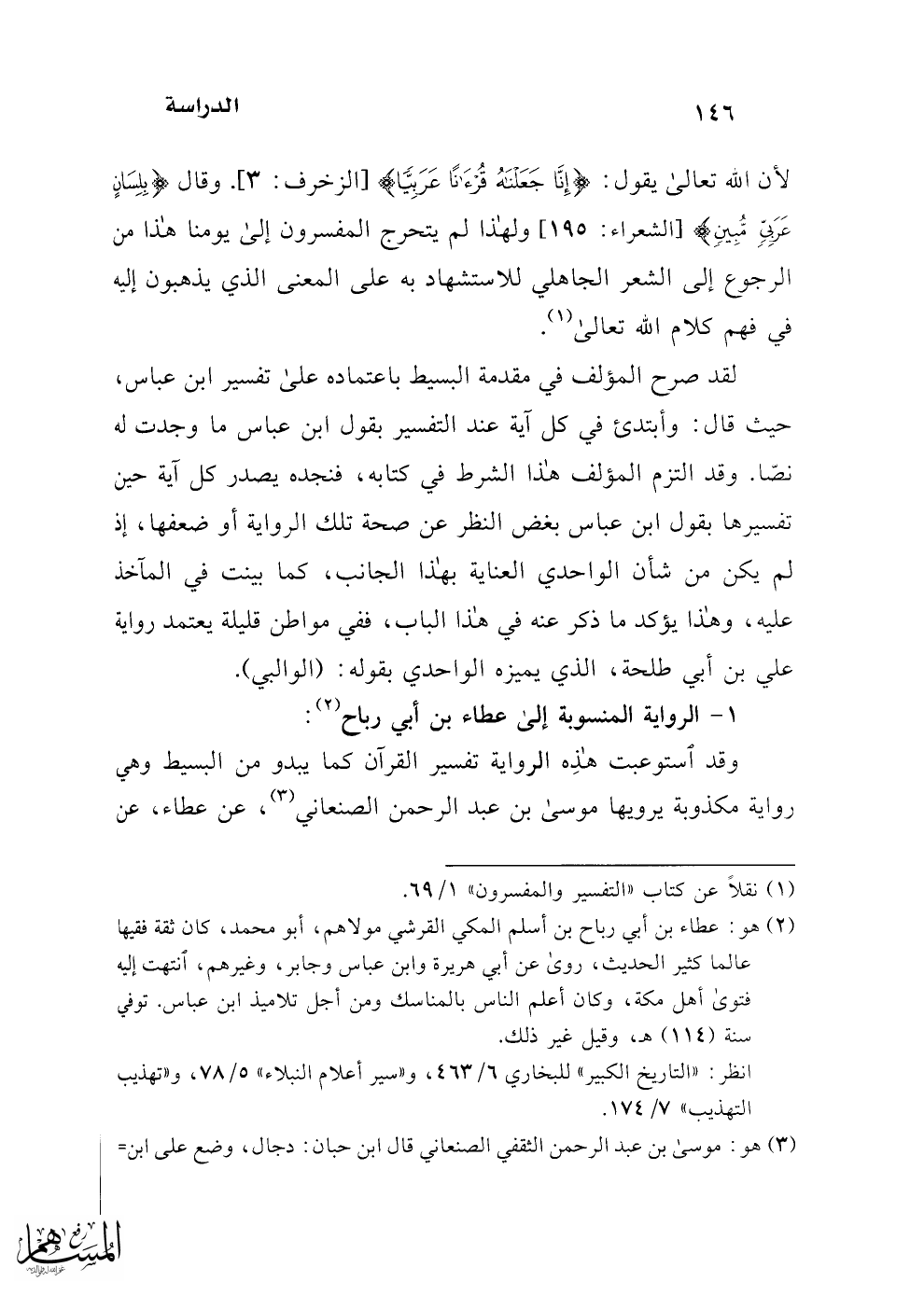 وقد استوعبت هذه الرواية تفسير القرآن كما يبدو من البسيط وهي رواية مكذوبة يرويها موسى بن عبد الرحمن الصنعاني (¬3)، عن عطاء، عن