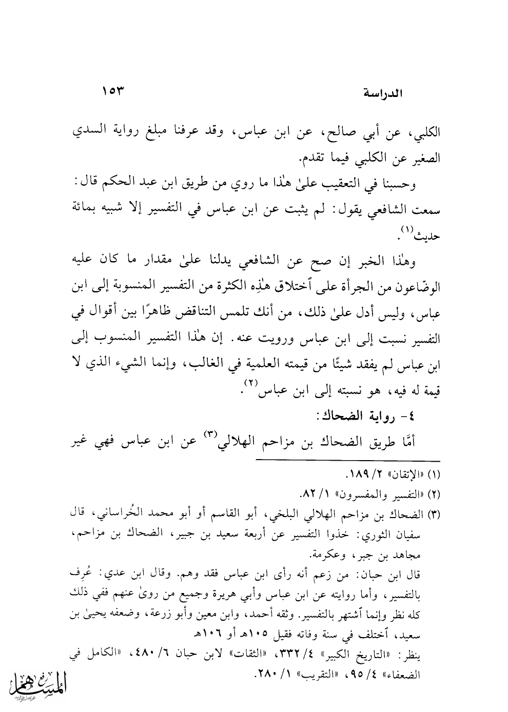 وهذا الخبر إن صح عن الشافعي يدلنا على مقدار ما كان عليه الوضّاعون من الجرأة على اختلاق هذه الكثرة من التفاسير المنسوبة إلى ابن عباس، وليس أدل على ذلك، من أنك تلمس التناقض ظاهرًا بين أقوال في التفسير نسبت إلى ابن عباس ورويت عنه. إن هذا التفسير المنسوب إلى ابن عباس لم يفقد شيئًا من قيمته العلمية في الغالب، وإنما الشيء الذي لا قيمة له فيه، هو نسبته إلى ابن عباس (¬2).
