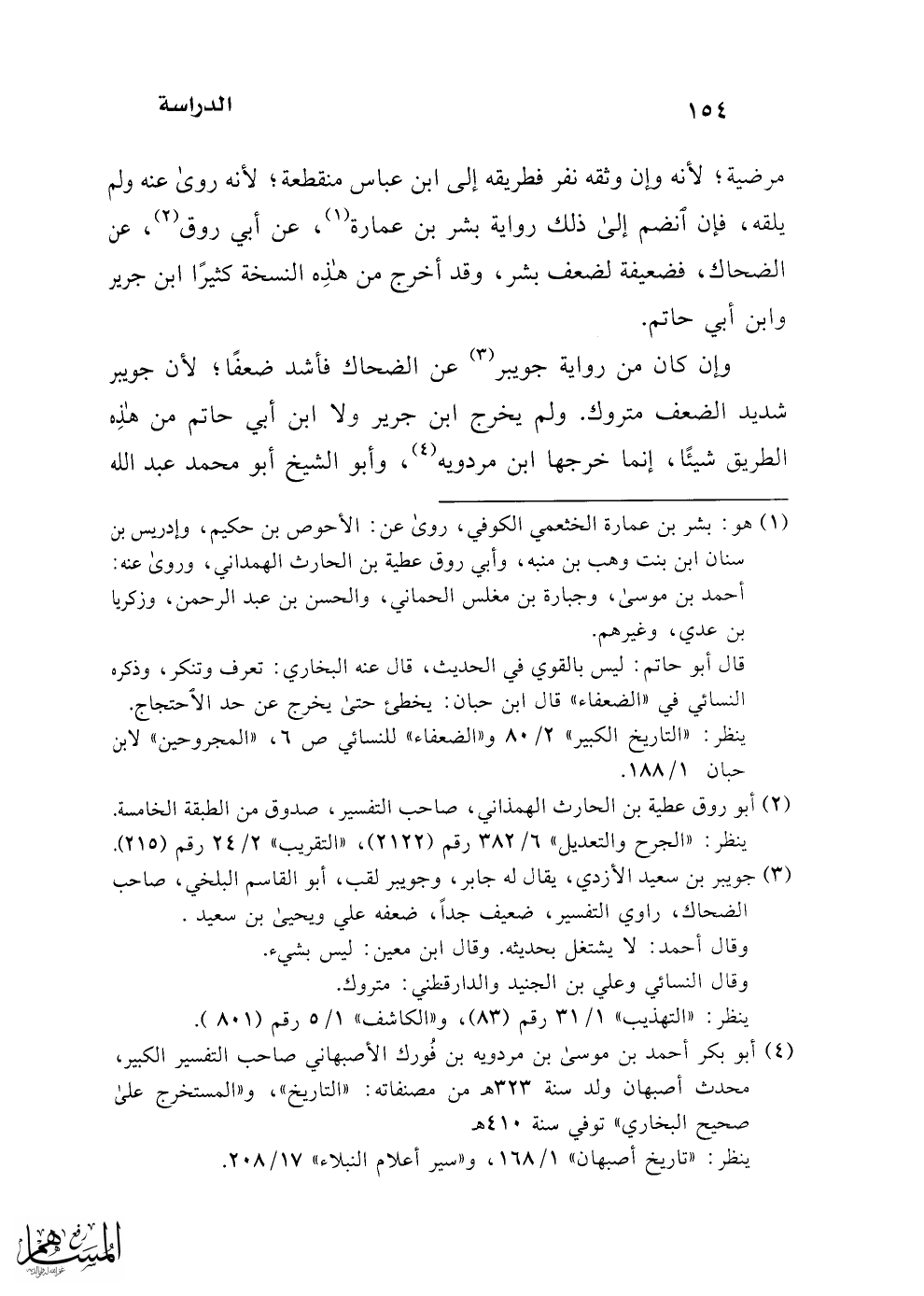 مرضية؛ لأنه وإن وثقه نفر فطريقه إلى ابن عباس منقطعة؛ لأنه روى عنه ولم يلقه، فإن انضم إلى ذلك رواية بشر بن عمارة (¬1)، عن أبي روق (¬2)، عن الضحاك، فضعيفة لضعف بشر، وقد أخرج من هذه النسخة كثيرًا ابن جرير وابن أبي حاتم.