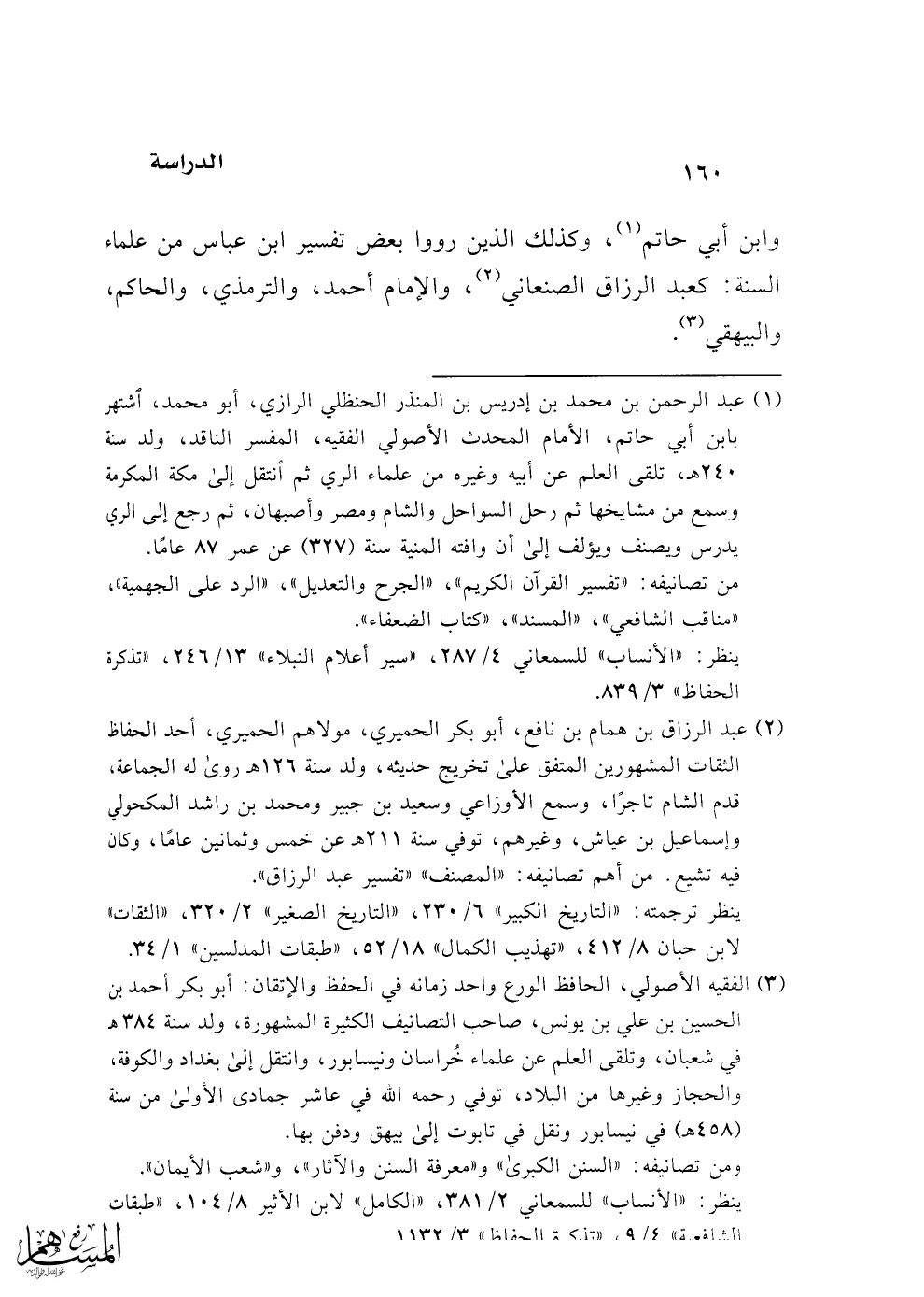 (¬1) عبد الرحمن بن محمد بن إدريس بن المنذر الحنظلي الرازي، أبو محمد، اشتهر بابن أبي حاتم، الأمام المحدث الأصولي الفقيه، المفسر الناقد، ولد سنة 240 هـ، تلقى العلم عن أبيه وغيره من علماء الري ثم انتقل إلى مكة المكرمة وسمع من مشايخها ثم رحل السواحل والشام ومصر وأصبهان، ثم رجع إلى الري يدرس ويصنف ويؤلف إلى أن وافته المنية سنة (327) عن عمر 87 عامًا.