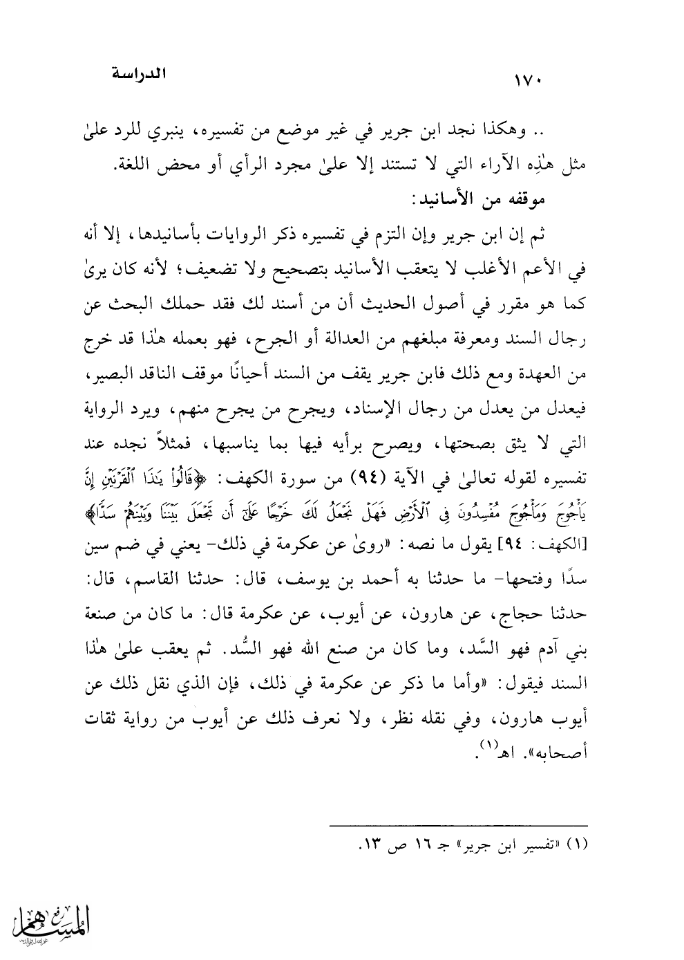 ثم إن ابن جرير وإن التزم في تفسيره ذكر الروايات بأسانيدها، إلا أنه في الأعم الأغلب لا يتعقب الأسانيد بتصحيح ولا تضعيف؛ لأنه كان يرى كما هو مقرر في أصول الحديث أن من أسند لك فقد حملك البحث عن رجال السند ومعرفة مبلغهم من العدالة أو الجرح، فهو بعمله هذا قد خرج من العهدة ومع ذلك فابن جرير يقف من السند أحيانًا موقف الناقد البصير، فيعدل من يعدل من رجال الإسناد، ويجرح من يجرح منهم، ويرد الرواية التي لا يثق بصحتها، ويصرح برأيه فيها بما يناسبها، فمثلاً نجده عند تفسيره لقوله تعالى في الآية (94) من سورة الكهف: {قَالُوا يَا ذَا الْقَرْنَيْنِ إِنَّ يَأْجُوجَ وَمَأْجُوجَ مُفْسِدُونَ فِي الْأَرْضِ فَهَلْ نَجْعَلُ لَكَ خَرْجًا عَلَى أَنْ تَجْعَلَ بَيْنَنَا وَبَيْنَهُمْ سَدًّا} [الكهف: 94] يقول ما نصه: "روى عن عكرمة في ذلك -يعني في ضم سين سدًا وفتحها- ما حدثنا به أحمد بن يوسف، قال: حدثنا القاسم، قال: حدثنا حجاج، عن هارون، عن أيوب، عن عكرمة قال: ما كان من صنعة بني آدم فهو السَّد، وما كان من صنع الله فهو السُّد. ثم يعقب على هذا السند فيقول: "وأما ما ذكر عن عكرمة في ذلك، فإن الذي نقل ذلك عن أيوب هارون، وفي نقله نظر، ولا نعرف ذلك عن أيوب من رواية ثقات أصحابه". اهـ (¬1).