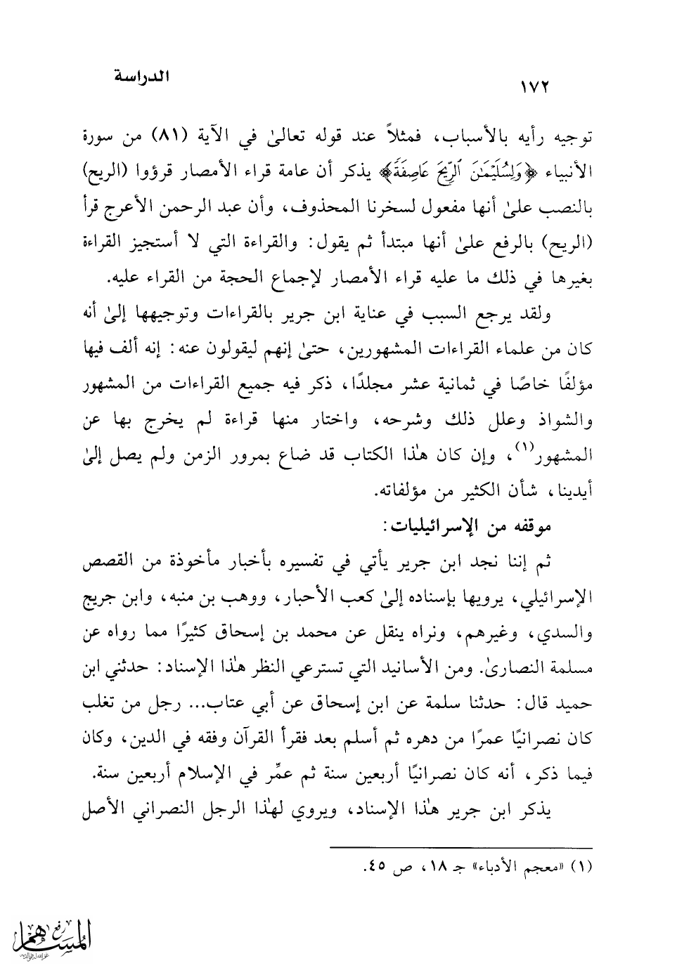 توجيه رأيه بالأسباب، فمثلاً عند قوله تعالى في الآية (81) من سورة الأنبياء {وَلِسُلَيْمَانَ الرِّيحَ عَاصِفَةً} يذكر أن عامة قراء الأمصار قرؤوا (الريح) بالنصب على أنها مفعول لسخرنا المحذوف، وأن عبد الرحمن الأعرج قرأ (الريح) بالرفع على أنها مبتدأ ثم يقول: والقراءة التي لا أستجيز القراءة بغيرها في ذلك ما عليه قراء الأمصار لإجماع الحجة من القراء عليه.