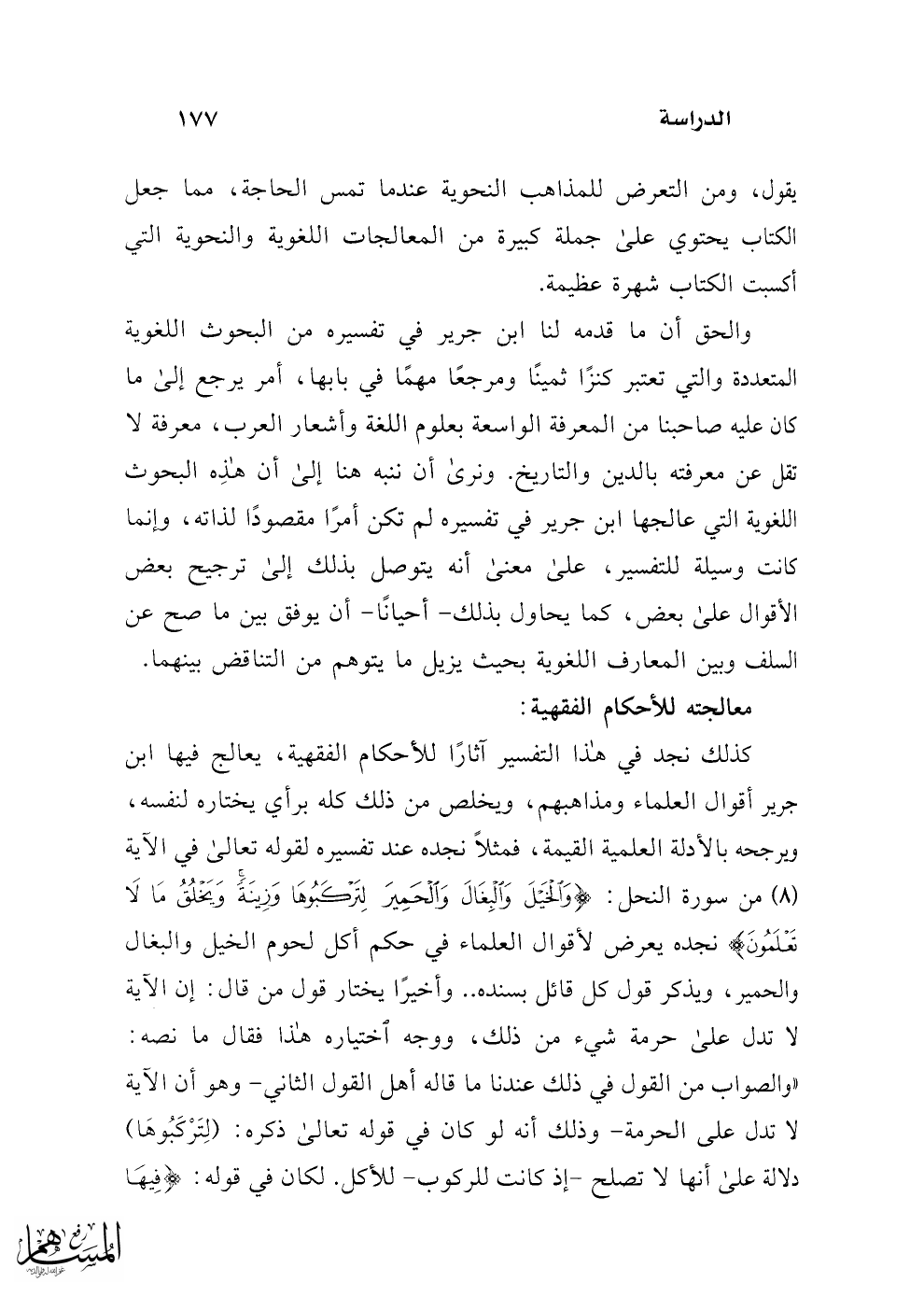والحق أن ما قدمه لنا ابن جرير في تفسيره من البحوث اللغوية المتعددة والتي تعتبر كنزًا ثمينًا ومرجعًا مهمًا في بابها، أمر يرجع إلى ما كان عليه صاحبنا من المعرفة الواسعة بعلوم اللغة وأشعار العرب، معرفة لا تقل عن معرفته بالدين والتاريخ. ونرى أن ننبه هنا إلى أن هذه البحوث اللغوية التي عالجها ابن جرير في تفسيره لم تكن أمرًا مقصودًا لذاته، وإنما كانت وسيلة للتفسير، على معنى أنه يتوصل بذلك إلى ترجيح بعض الأقوال على بعض، كما يحاول بذلك -أحيانًا- أن يوفق بين ما صح عن السلف وبين المعارف اللغوية بحيث يزيل ما يتوهم من التناقض بينهما.