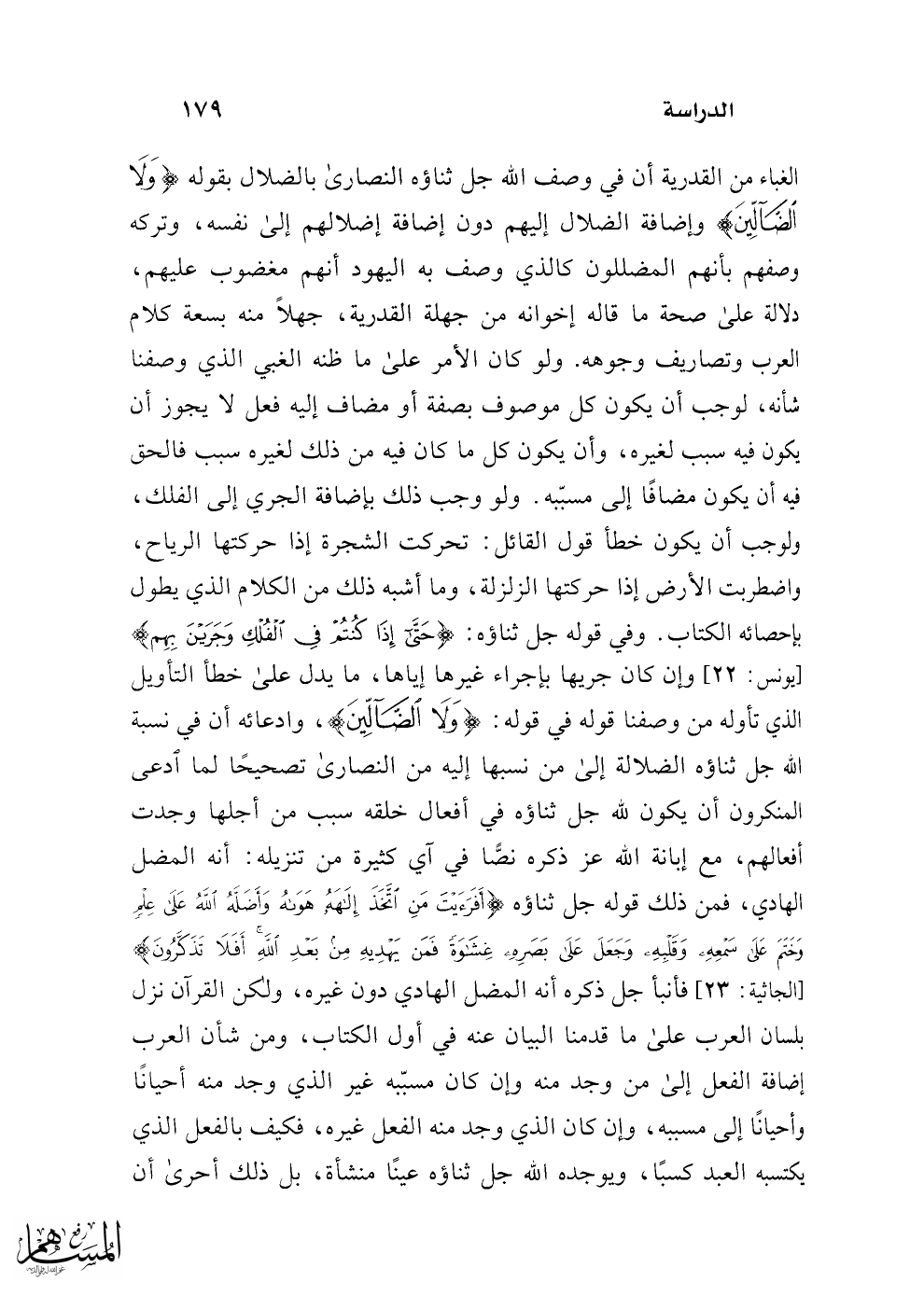 الغباء من القدرية أن في وصف الله جل ثناؤه النصارى بالضلال بقوله {وَلَا الضَّالِّينَ} وإضافة الضلال إليهم دون إضافة إضلالهم إلى نفسه، وتركه وصفهم بأنهم المضللون كالذي وصف به اليهود أنهم مغضوب عليهم، دلالة على صحة ما قاله إخوانه من جهلة القدرية، جهلاً منه بسعة كلام العرب وتصاريف وجوهه. ولو كان الأمر على ما ظنه الغبي الذي وصفنا شأنه، لوجب أن يكون كل موصوف بصفة أو مضاف إليه فعل لا يجوز أن يكون فيه سبب لغيره، وأن يكون كل ما كان فيه من ذلك لغيره سبب فالحق فيه أن يكون مضافًا إلى مسبّبه. ولو وجب ذلك بإضافة الجري إلى الفلك، ولوجب أن يكون خطأ قول القائل: تحركت الشجرة إذا حركتها الرياح، واضطربت الأرض إذا حركتها الزلزلة، وما أشبه ذلك من الكلام الذي يطول بإحصائه الكتاب. وفي قوله جل ثناؤه: {حَتَّى إِذَا كُنْتُمْ فِي الْفُلْكِ وَجَرَيْنَ بِهِمْ} {يونس: 22} ان كان جريها بإجراء غيرِها إياها، ما يدل على خطأ التأويل الذي تأوله من وصفنا قوله في قوله: {وَلَا الضَّالِّينَ}، وادعائه أن في نسبة الله جل ثناؤه الضلالة إلى من نسبها إليه من النصارى تصحيحًا لما ادعى المنكرون أن يكون لله جل ثناؤه في أفعال خلقه سبب من أجلها وجدت أفعالهم، مع إبانة الله عز ذكره نصًّا في آي كثيرة من تنزيله: أنه المضل الهادي، فمن ذلك قوله جل ثناؤه {أَفَرَأَيْتَ مَنِ اتَّخَذَ إِلَهَهُ هَوَاهُ وَأَضَلَّهُ اللَّهُ عَلَى عِلْمٍ وَخَتَمَ عَلَى سَمْعِهِ وَقَلْبِهِ وَجَعَلَ عَلَى بَصَرِهِ غِشَاوَةً فَمَنْ يَهْدِيهِ مِنْ بَعْدِ اللَّهِ أَفَلَا تَذَكَّرُونَ} [الجاثية: 23] فأنبأ جل ذكره أنه المضل الهادي دون غيره، ولكن القرآن نزل بلسان العرب على ما قدمنا البيان عنه في أول الكتاب، ومن شأن العرب إضافة الفعل إلى من وجد منه وإن كان مسبّبه غير الذي وجد منه أحيانًا وأحيانًا إلى مسببه، وإن كان الذي وجد منه الفعل غيره، فكيف بالفعل الذي يكتسبه العبد كسبًا، ويوجده الله جل ثناؤه عينًا منشأة، بل ذلك أحرى أن