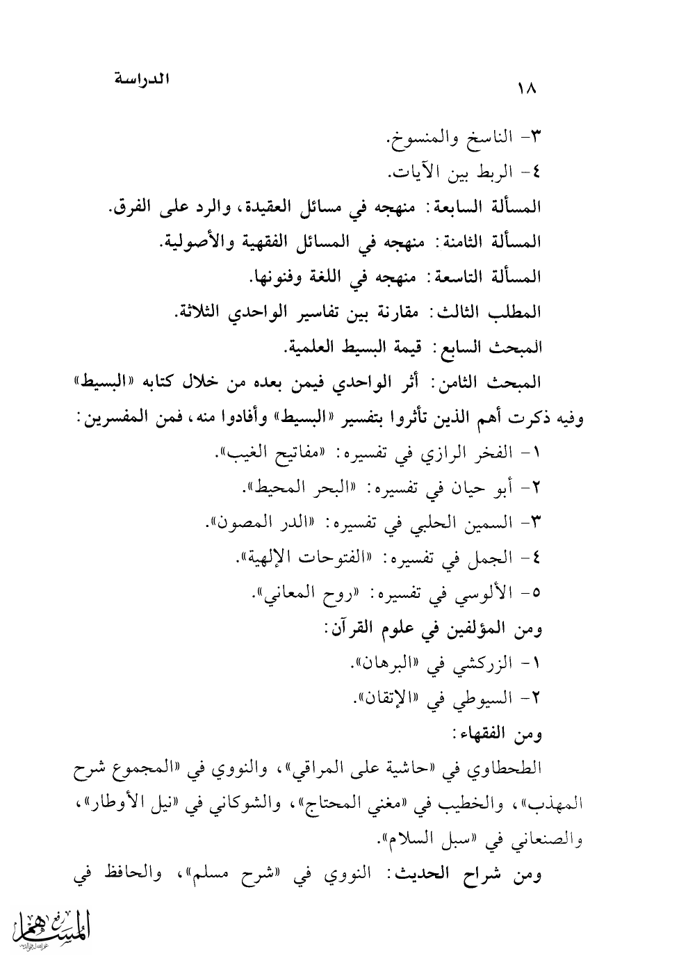 المبحث الثامن: أثر الواحدي فيمن بعده من خلال كتابه "البسيط" وفيه ذكرت أهم الذين تأثروا بتفسير "البسيط" وأفادوا منه، فمن المفسرين: