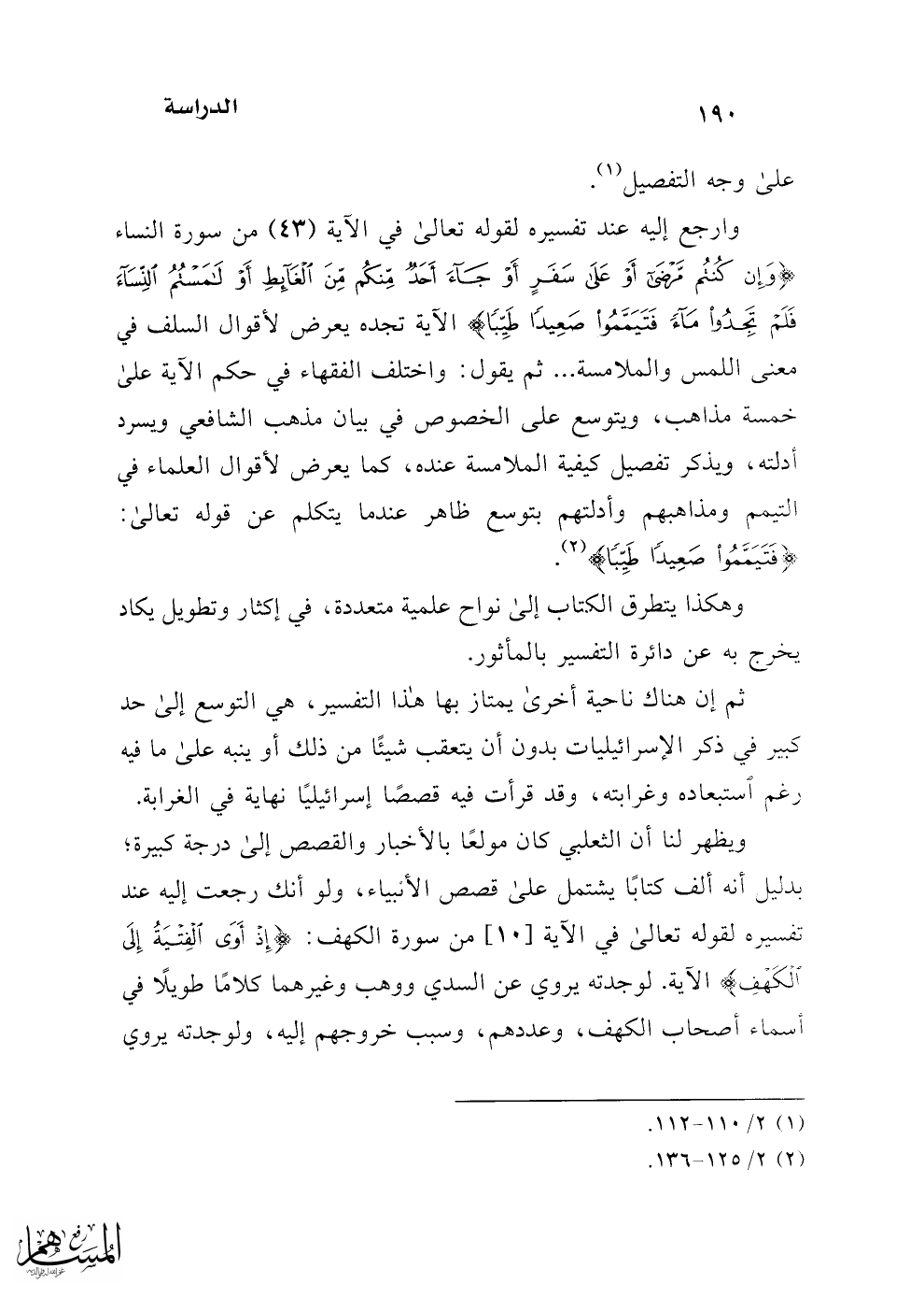 وارجع إليه عند تفسيره لقوله تعالى في الآية (43) من سورة النساء {وَإِنْ كُنْتُمْ مَرْضَى أَوْ عَلَى سَفَرٍ أَوْ جَاءَ أَحَدٌ مِنْكُمْ مِنَ الْغَائِطِ أَوْ لَامَسْتُمُ النِّسَاءَ فَلَمْ تَجِدُوا مَاءً فَتَيَمَّمُوا صَعِيدًا طَيِّبًا} الآية تجده يعرض لأقوال السلف في معنى اللمس والملامسة ... ثم يقول: واختلف الفقهاء في حكم الآية على خمسة مذاهب، ويتوسع على الخصوص في بيان مذهب الشافعي ويسرد أدلته، ويذكر تفصيل كيفية الملامسة عنده، كما يعرض لأقوال العلماء في التيمم ومذاهبهم وأدلتهم بتوسع ظاهر عندما يتكلم عن قوله تعالى: {فَتَيَمَّمُوا صَعِيدًا طَيِّبًا} (¬2).