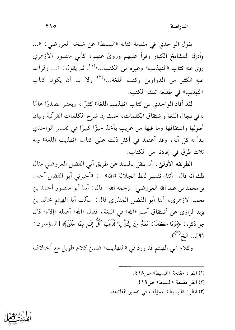 يقول الواحدي في مقدمة كتابه "البسيط" عن شيخه العروضي: " ... وأدرك المشايخ الكبار وقرأ عليهم وروى عنهم، كأبي منصور الأزهري روى عنه كتاب "التهذيب" وغيره من الكتب ... " (¬1). ثم يقول: " ... وقرأت عليه الكثير من الدواوين وكتب اللغة ... " (¬2) ولا بد أن يكون كتاب "التهذيب" في طليعة تلك الكتب.