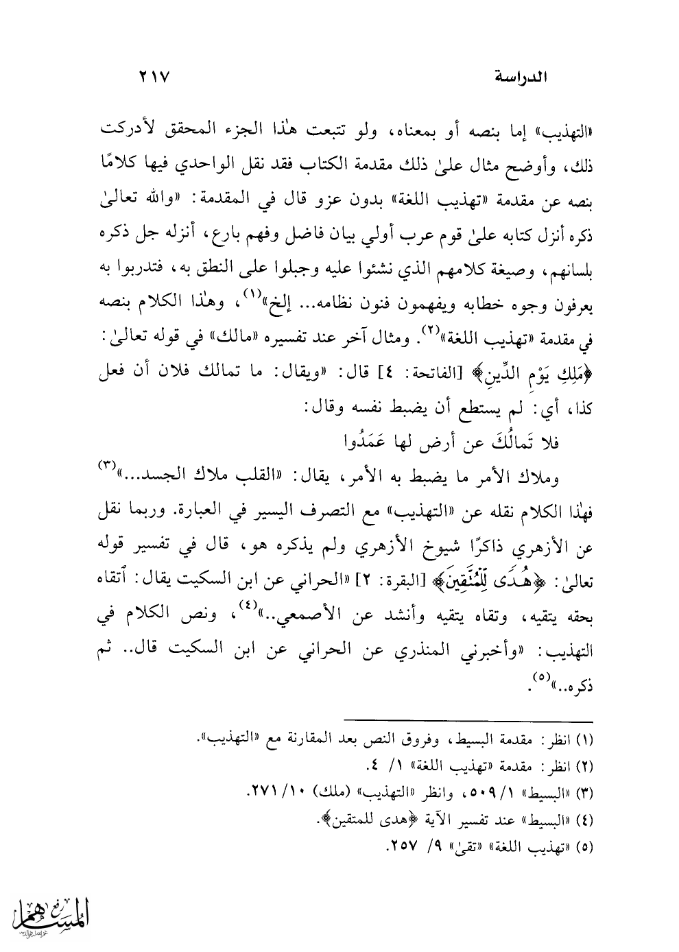"التهذيب" إما بنصه أو بمعناه، ولو تتبعت هذا الجزء المحقق لأدركت ذلك، وأوضح مثال على ذلك مقدمة الكتاب فقد نقل الواحدي فيها كلامًا بنصه عن مقدمة "تهذيب اللغة" بدون عزو قال في المقدمة: "والله تعالى ذكره أنزل كتابه على قوم عرب أولي بيان فاضل وفهم بارع، أنزله جل ذكره بلسانهم، وصيغة كلامهم الذي نشئوا عليه وجبلوا على النطق به، فتدربوا به يعرفون وجوه خطابه ويفهمون فنون نظامه ... إلخ" (¬1)، وهذا الكلام بنصه في مقدمة "تهذيب اللغة" (¬2). ومثال آخر عند تفسيره "مالك" في قوله تعالى: {مَلِكِ يَوْمِ الدِّينِ} [الفاتحة: 4] قال: "ويقال: ما تمالك فلان أن فعل كذا، أي: لم يستطع أن يضبط نفسه وقال: